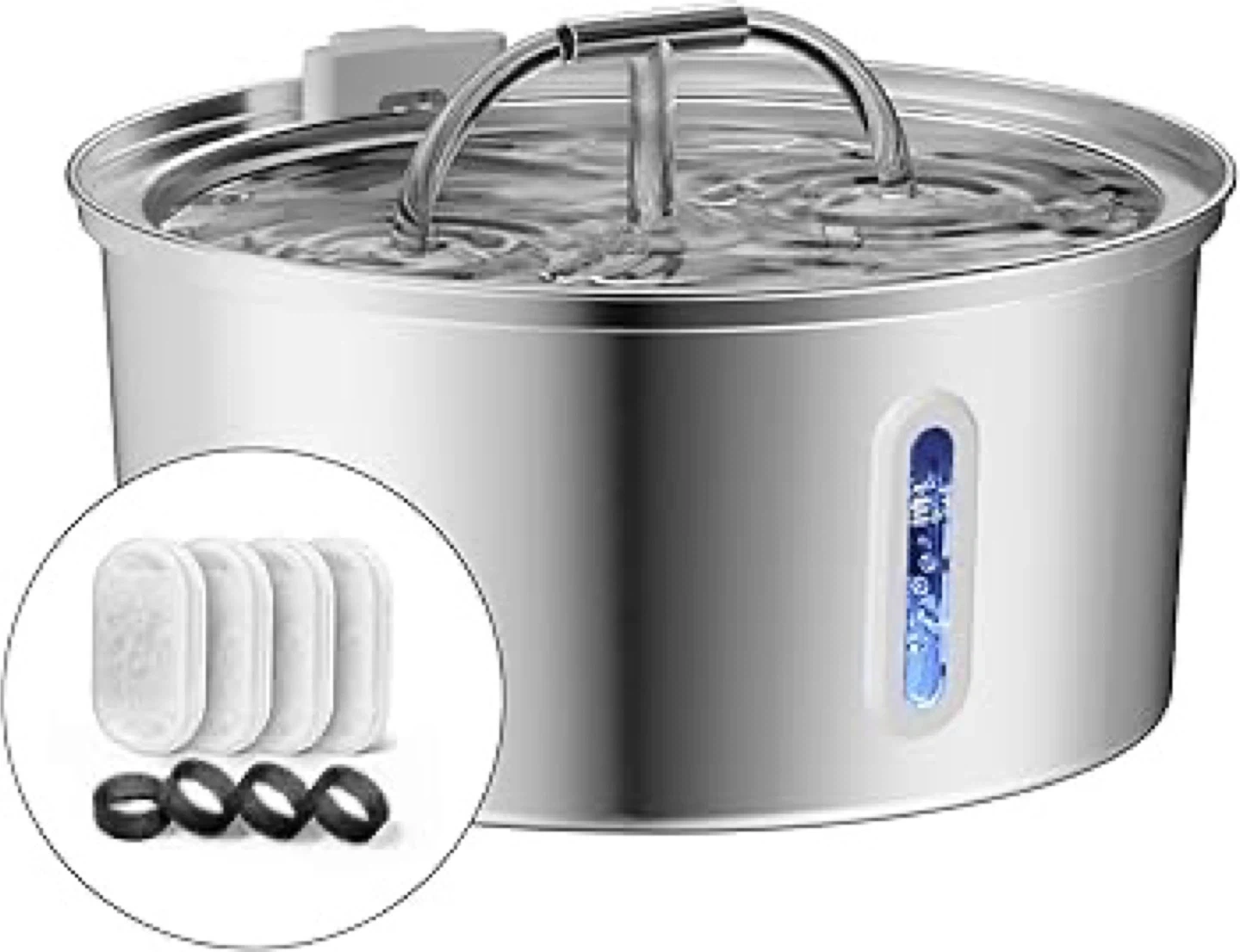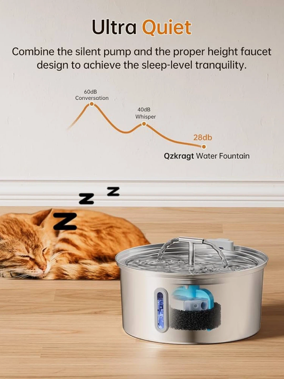 This pet water fountain is ultra quiet, operating at 28db. It features dual water streams and a multiple layer filtration system for fresh water. Includes filters and replacement rings.