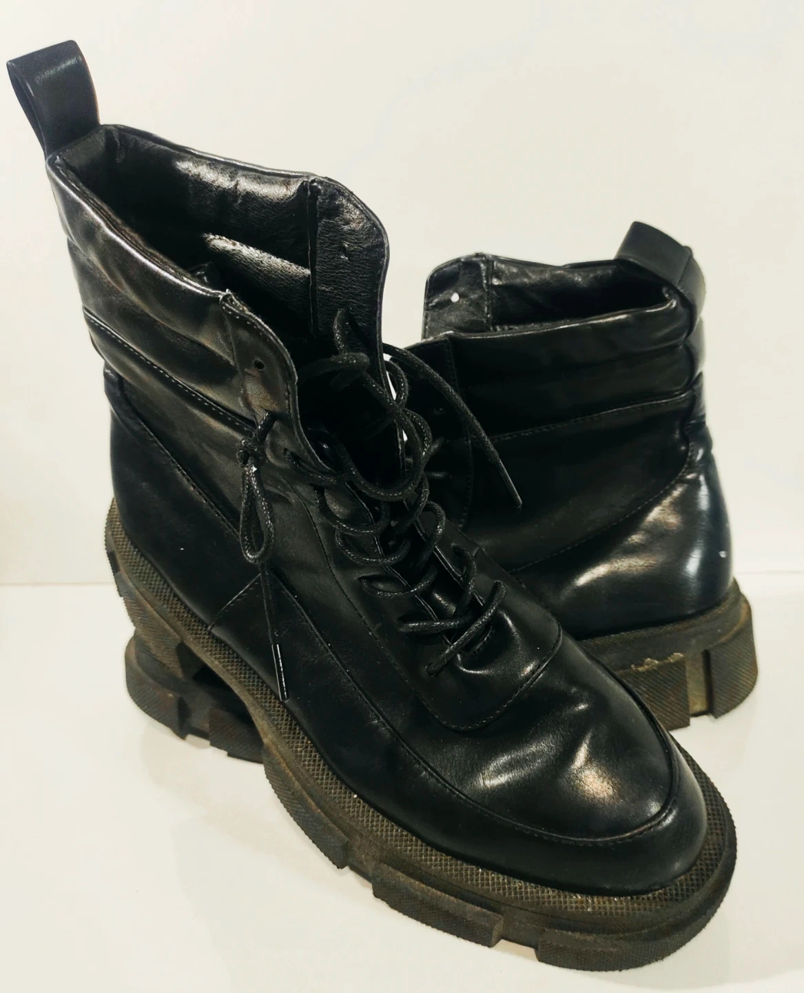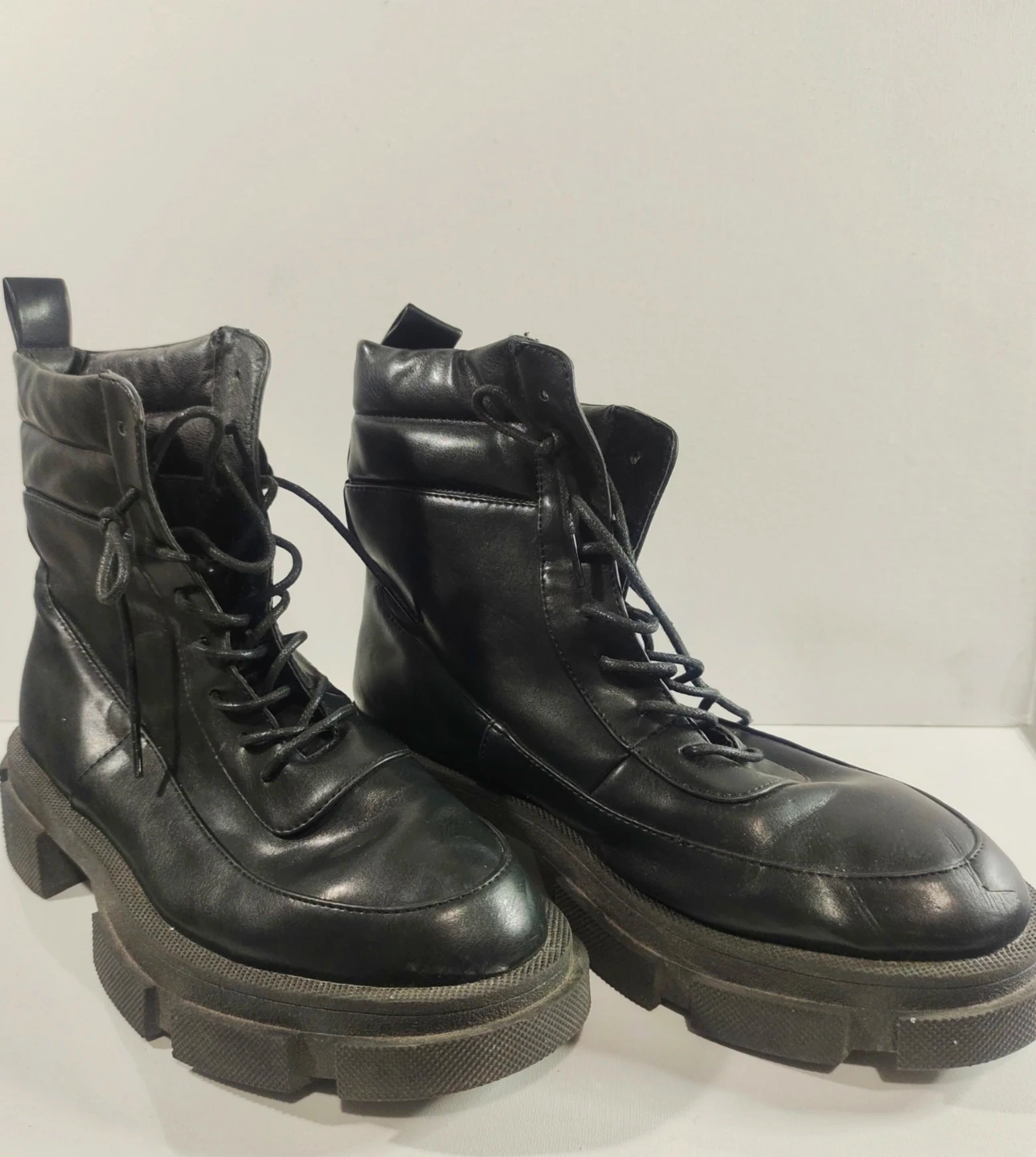 These black combat boots are from Wild Diva. They're made of leather with a lace-up front and a chunky lug sole. These boots are great for adding an edgy vibe to any outfit!