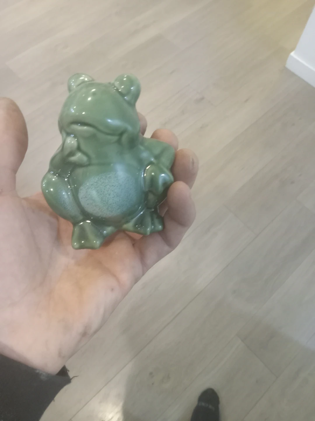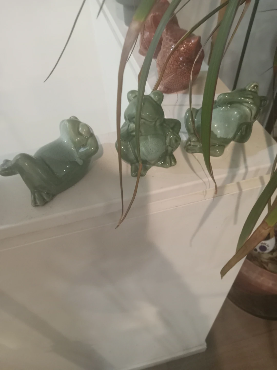 Three cute ceramic frogs in a glossy green finish. They're decorative pieces shaped like frogs in various relaxed poses. These would look neat on a shelf or desk.