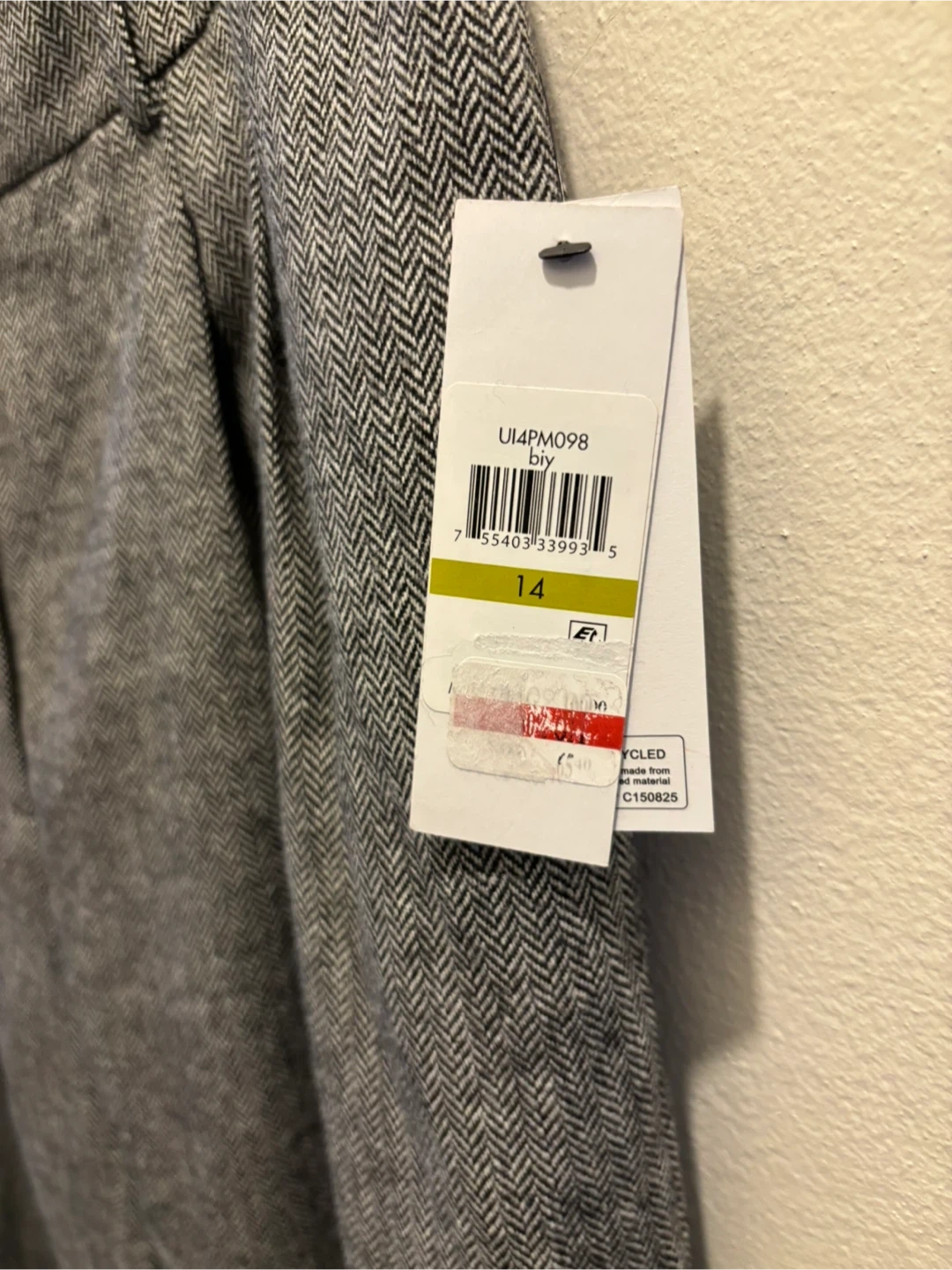 These DKNY pants feature a classic gray herringbone pattern. They're a size 14 with a wide-leg silhouette. Made with a blend of materials for comfort and durability.