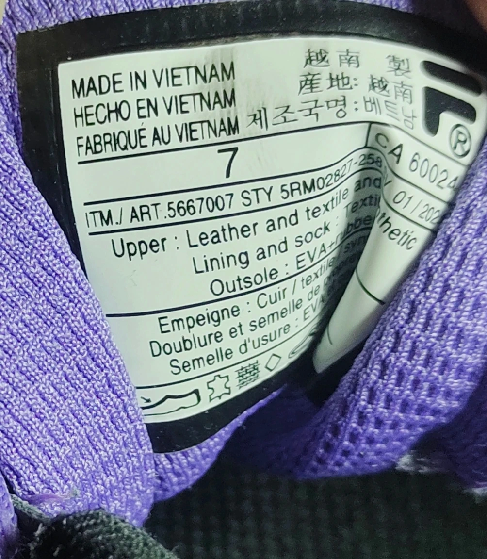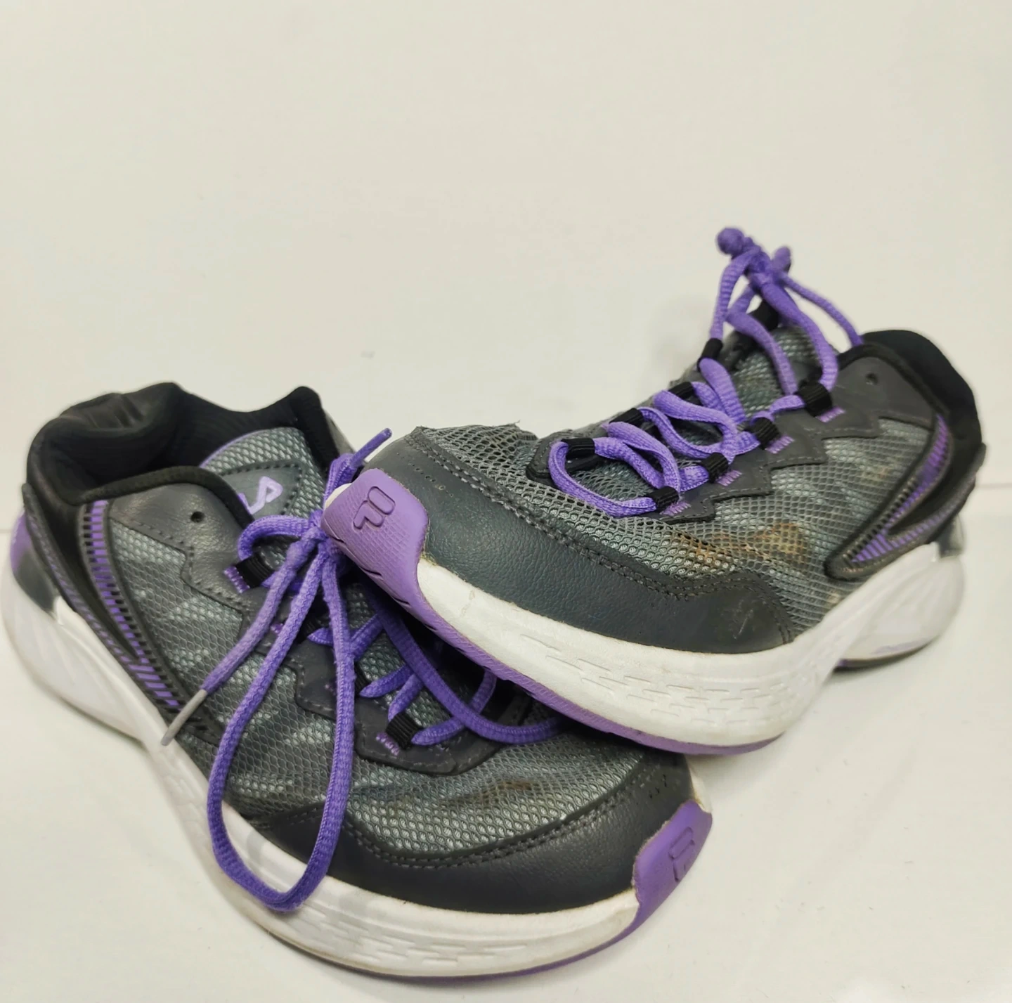 Fila running shoes in grey with purple accents. They're a women's size 7. The upper is leather and textile, with a textile lining and sock. Outsole is EVA rubber.