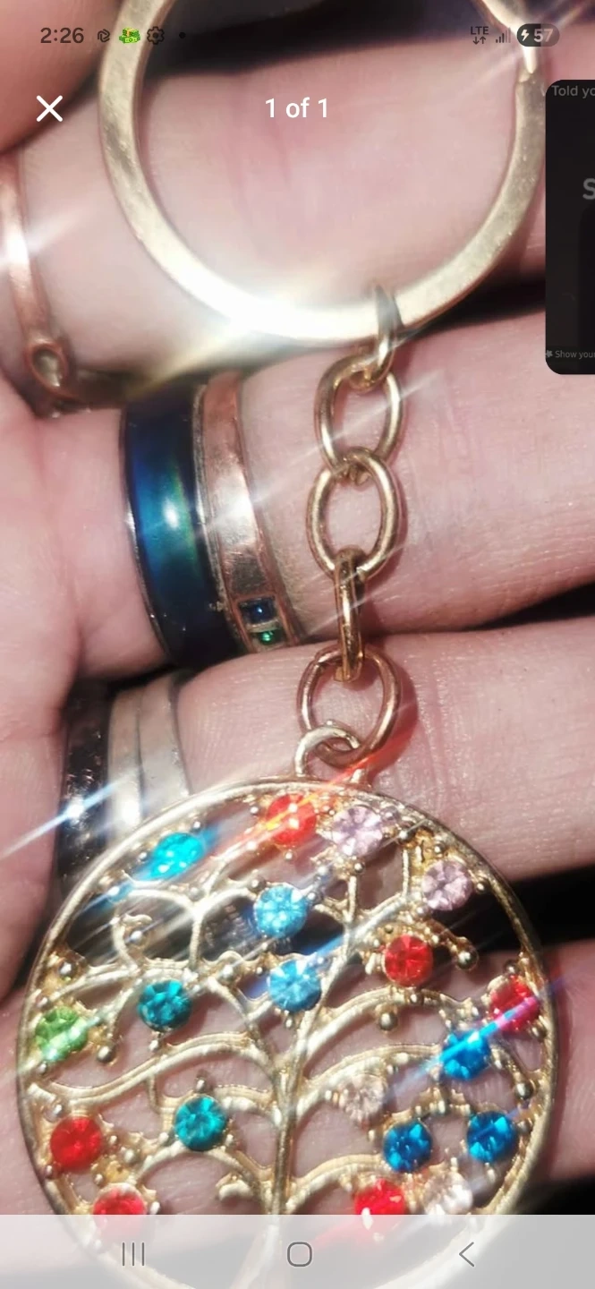 A decorative keychain featuring a gold-toned tree of life design. It's adorned with small, colourful rhinestones in red, blue, green, and pink. The chain attaches to a standard keyring. Pick it up only unless near intersection of Oxford and Gammage St.