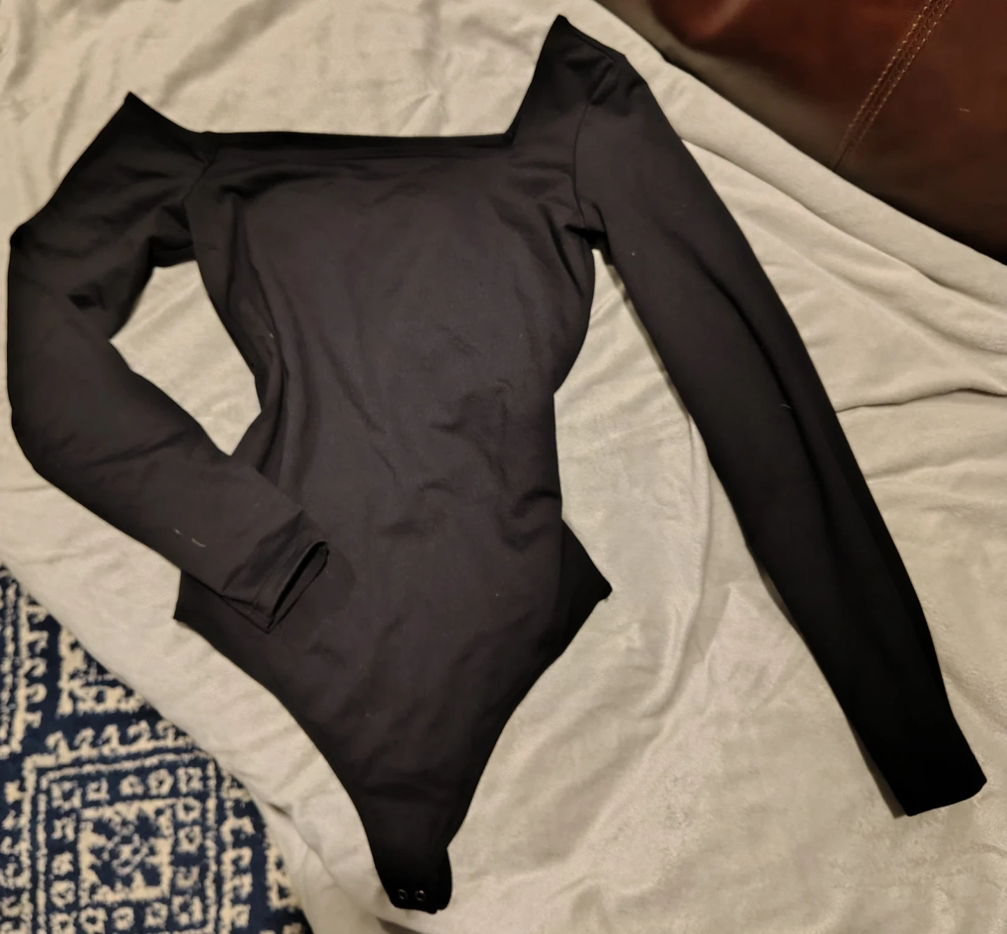 Abercrombie & Fitch soft A&F Collection long sleeve bodysuit. Features an off-the-shoulder square neckline. Made from a comfortable, stretchy fabric. Size small. Worn once. It's asymmetrical so one sleeve sits on the shoulder and the other is off the should style.