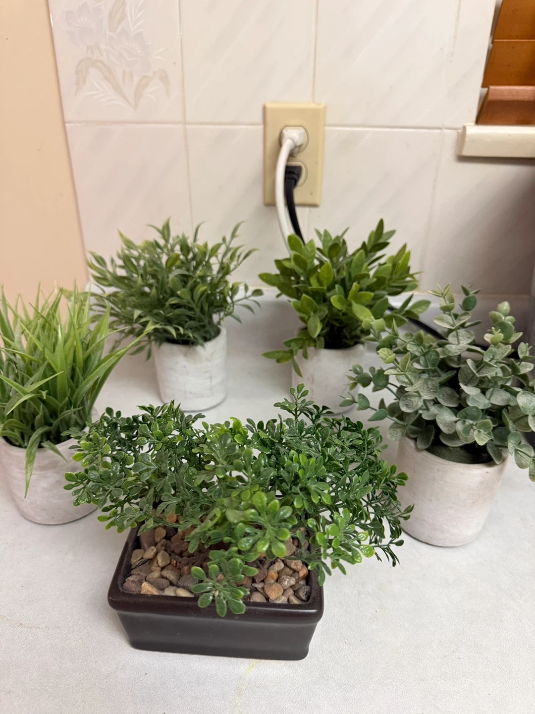 Five artificial plants, each in its own decorative pot. These require no watering or sunlight and are great for adding a touch of green to any space. They come in various styles and sizes.