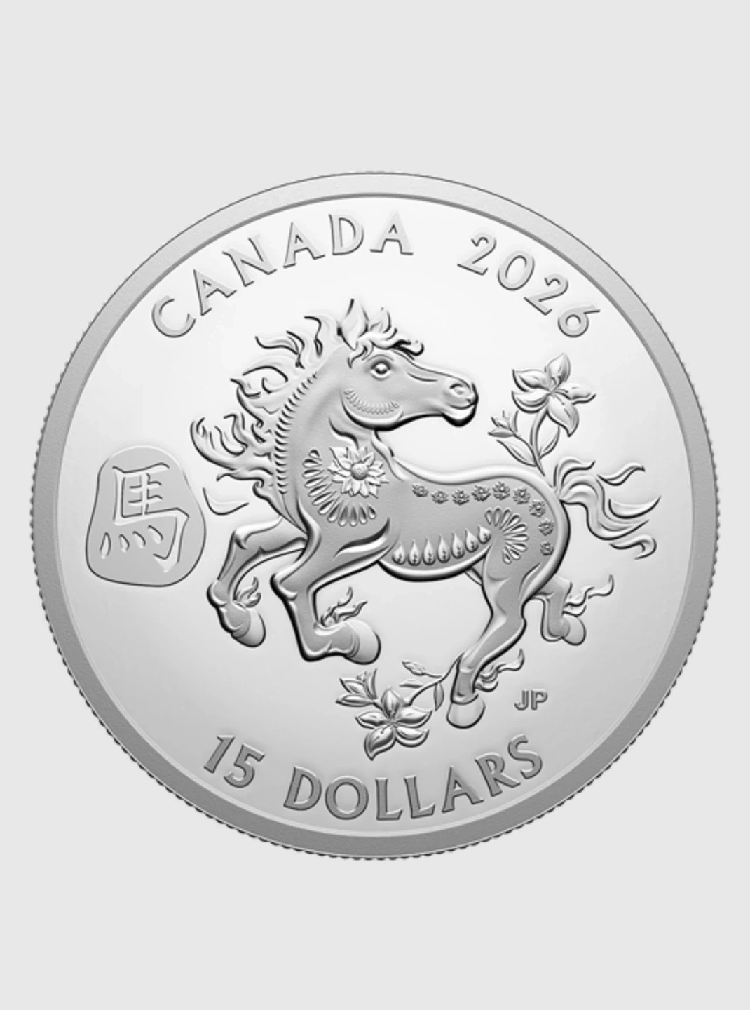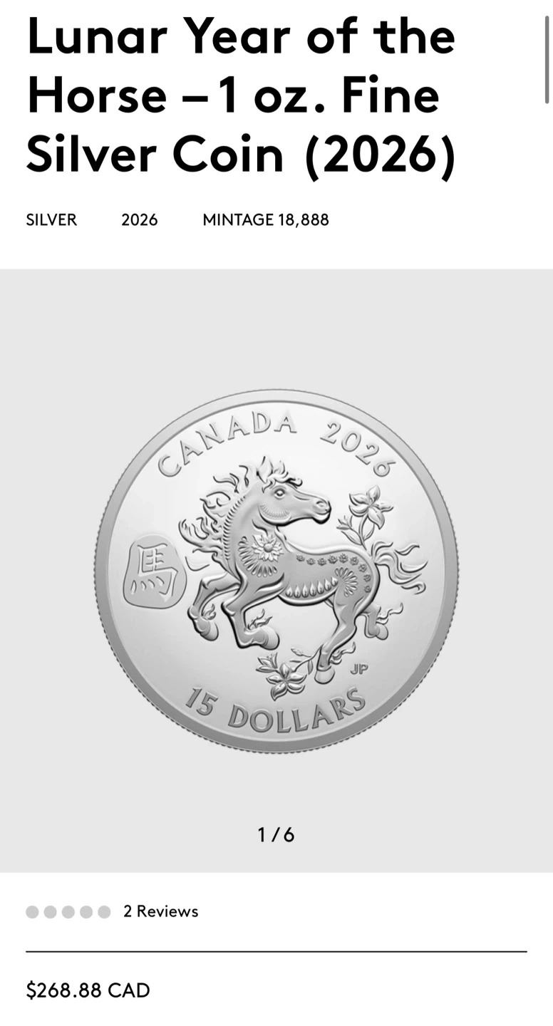 This 2026 fine silver coin features the Lunar Year of the Horse design. It's a collectible piece from the Royal Canadian Mint. The coin comes in a protective display box, making it great for collectors.