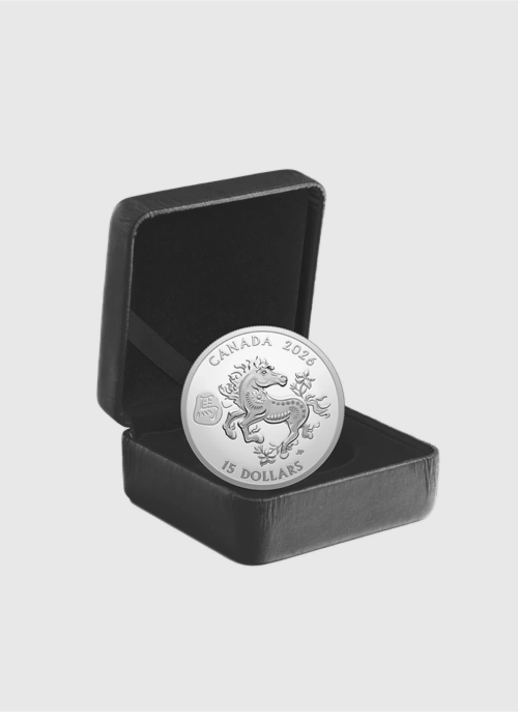 This 2026 fine silver coin features the Lunar Year of the Horse design. It's a collectible piece from the Royal Canadian Mint. The coin comes in a protective display box, making it great for collectors.