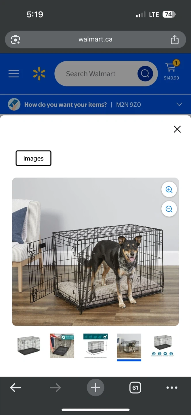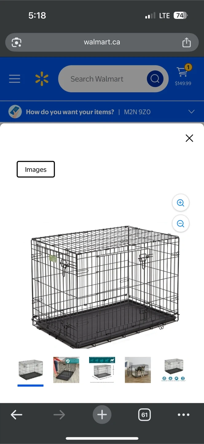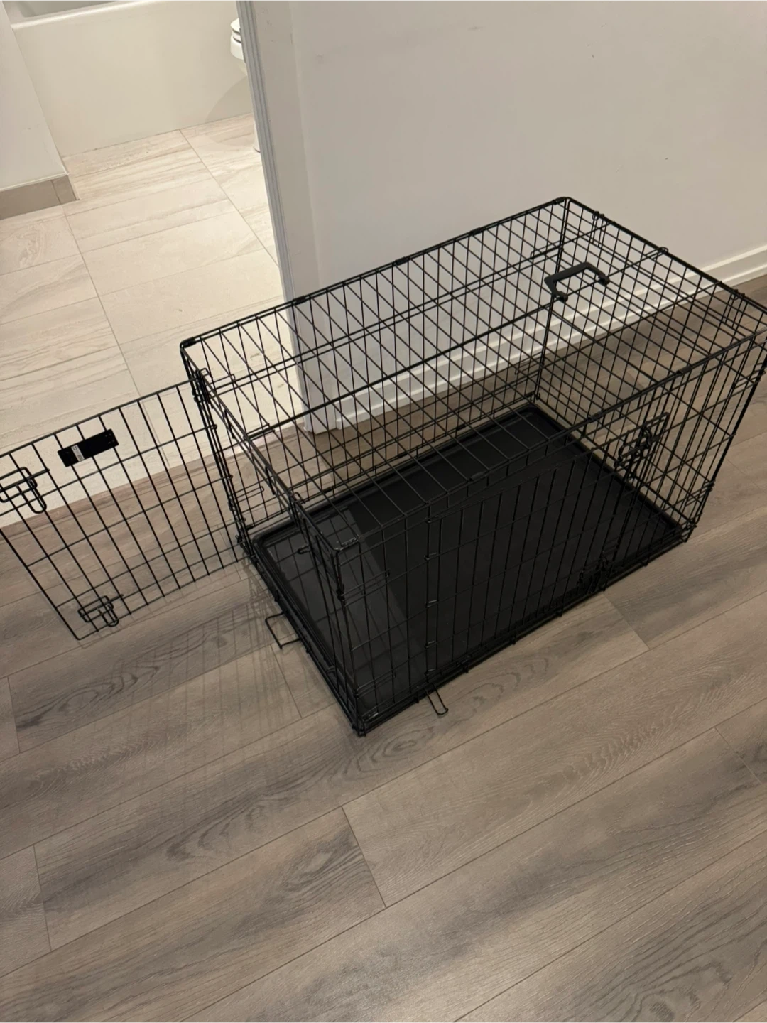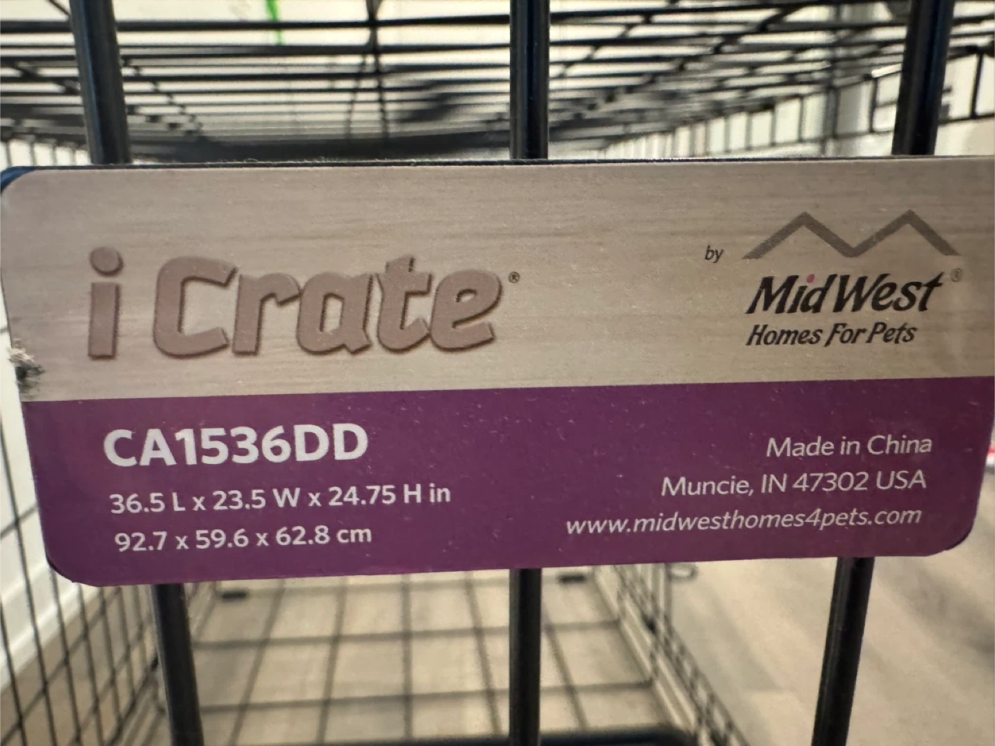 This is a MidWest iCrate pet crate, model CA1536DD. It's a wire dog crate with a black plastic tray. Dimensions are 36.5 L x 23.5 W x 24.75 H inches.