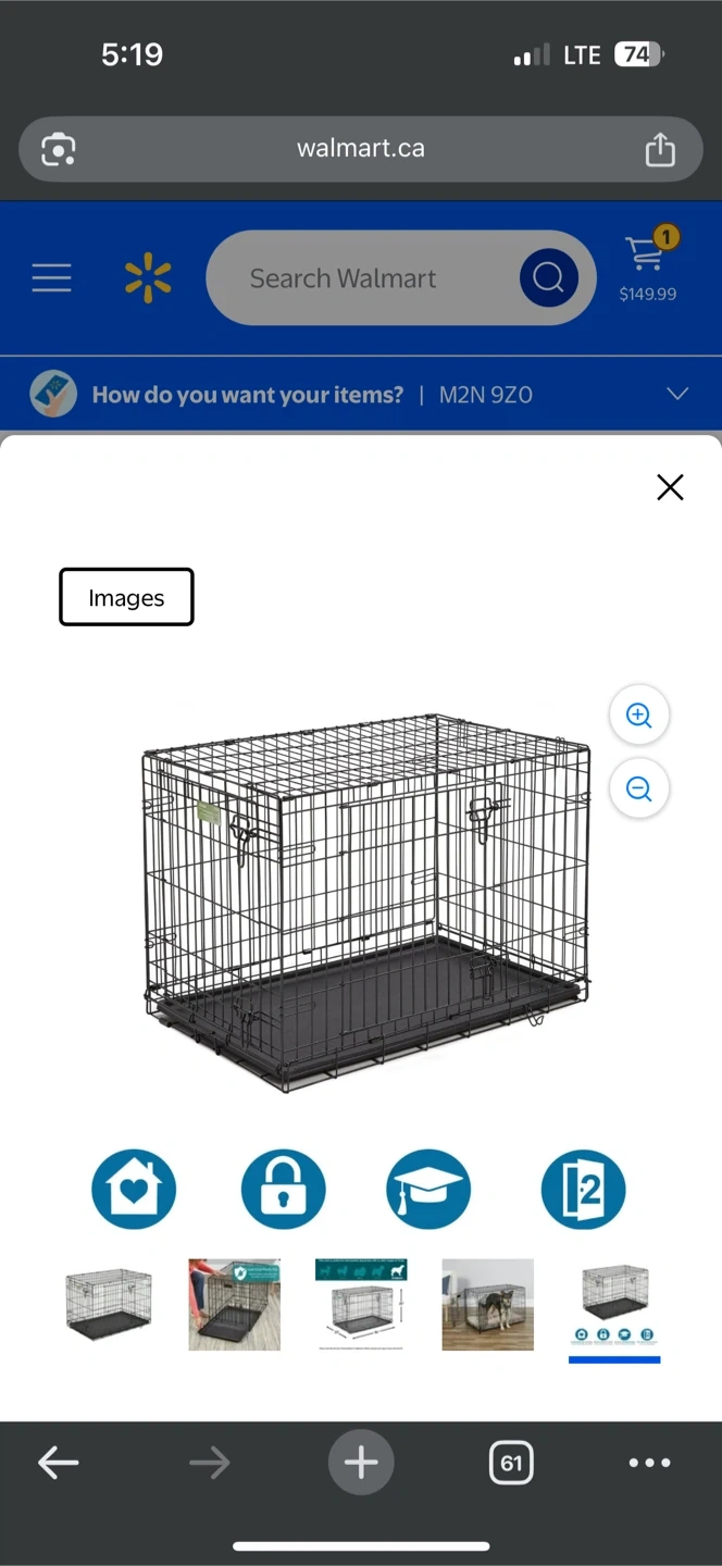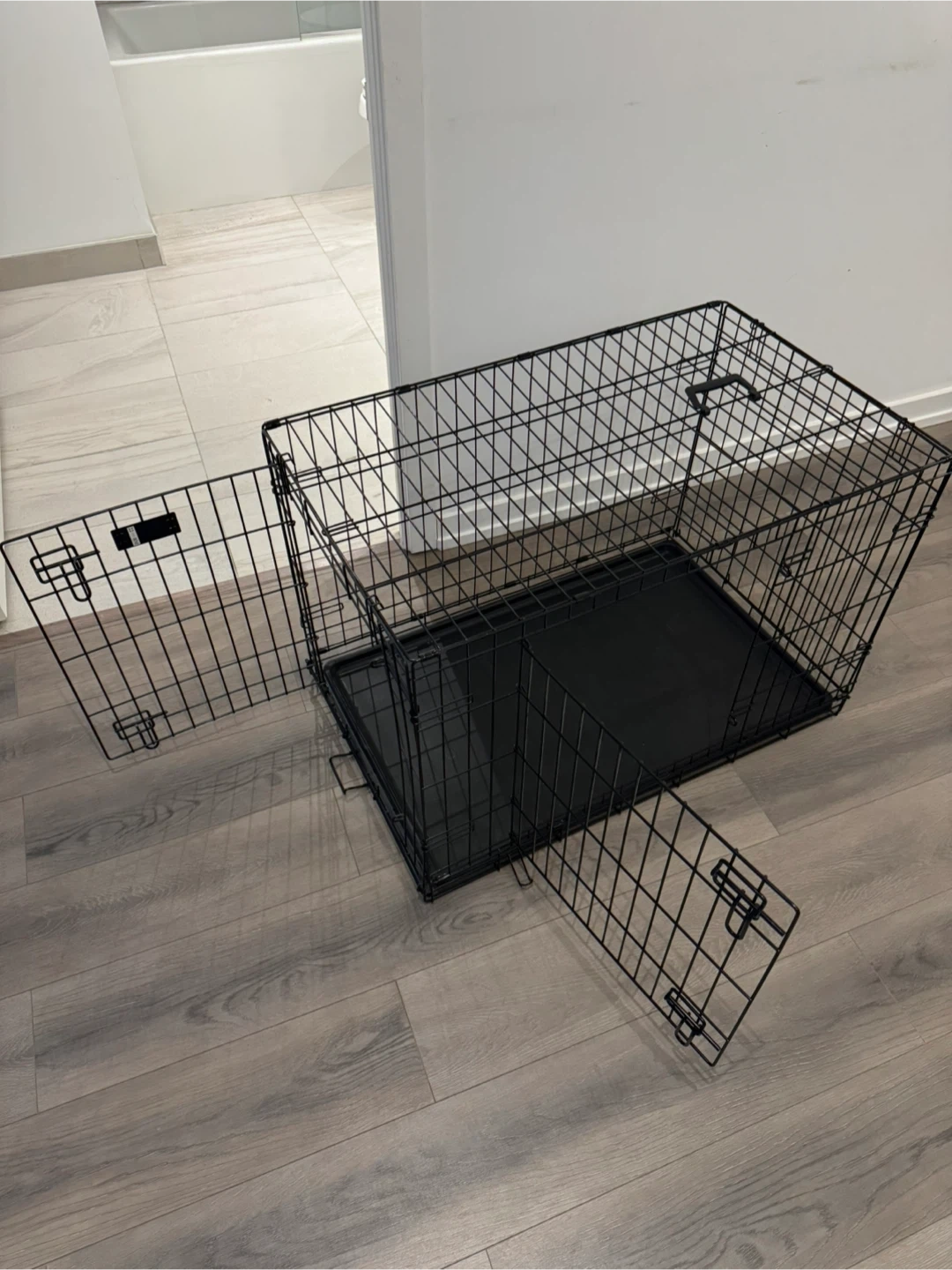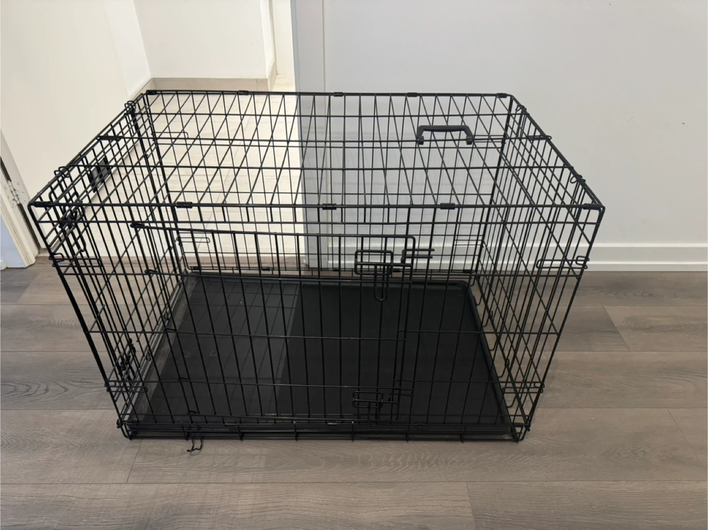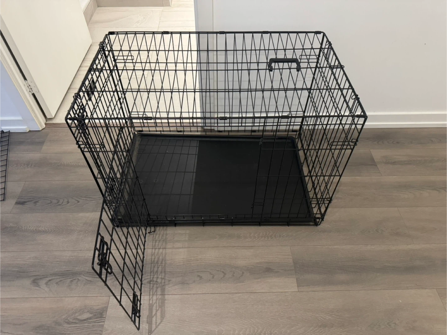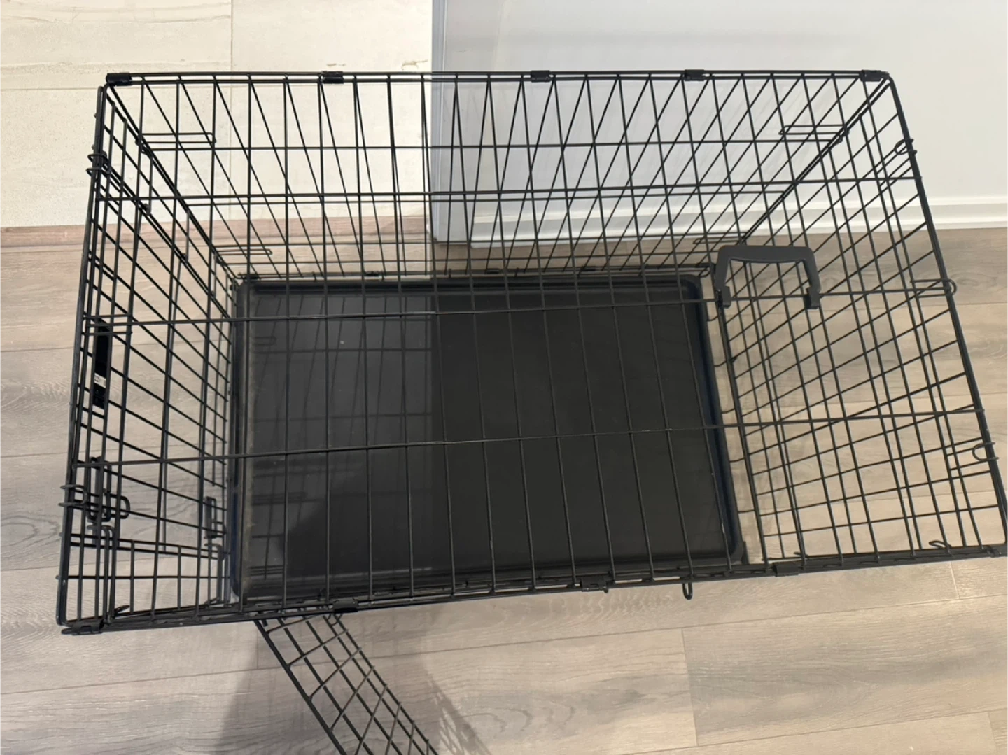 This is a MidWest iCrate pet crate, model CA1536DD. It's a wire dog crate with a black plastic tray. Dimensions are 36.5 L x 23.5 W x 24.75 H inches.