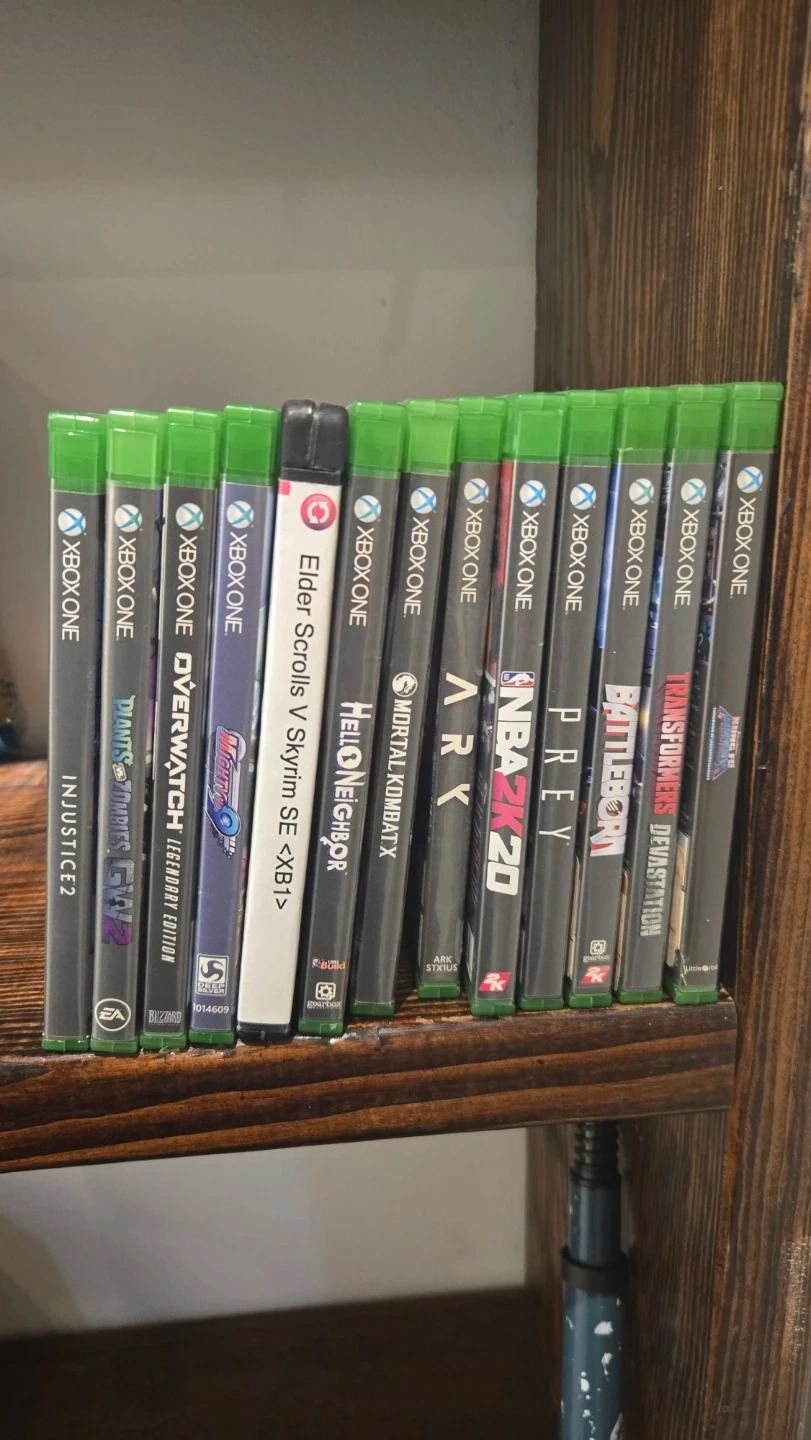 This is a lot of Xbox One games. It includes Injustice 2, Plants vs. Zombies: Garden Warfare 2, Overwatch Legendary Edition, Mighty No. 9, Elder Scrolls V: Skyrim SE, Hello Neighbor, Mortal Kombat X, ARK: Survival Evolved, NBA 2K20, Prey, Battleborn, and Transformers: Devastation. These are all disc versions for Xbox One.
