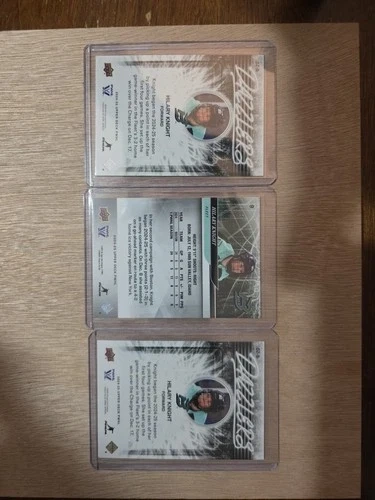 Own a piece of professional hockey history! This lot features three essential cards of Team USA legend and Boston Fleet Captain, Hilary Knight, from the landmark 2024-25 Upper Deck PWHL 1st Edition set. Because 2024-25 is the Inaugural Season of the PWHL, these are Hilary Knight’s official professional rookie cards. While she has had Olympic cards in the past, this is the first time in history she has a licensed card for a professional league—making every player in this set a "rookie" in the eyes of the hobby. This 3-Card Collection Includes: Dazzlers PURPLE (DZ-8): Rare Blaster-Exclusive parallel! Only found in retail boxes, making it a must-have for rainbow collectors. Dazzlers BLUE (DZ-8): The classic electric blue foil insert. Base Card (#9): The foundational card for the Boston Fleet’s first-ever season. All cards were pack-pulled and immediately sleeved. They are in Near Mint/Mint condition.