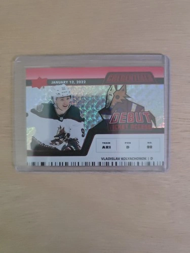Up for sale is a rare Horizontal Red Parallel of Arizona Coyotes defenseman Vladislav Kolyachonok from the 2021-22 Upper Deck Credentials set. This card is part of the high-end Debut Ticket Access subset, featuring a sleek ticket-style design with a vibrant red holographic finish. Key Highlights: Low Serial Number: This card is hand-numbered 243/299 on the back. Short Print Rarity: As a "Level 4" Debut Ticket Access card, it is significantly harder to pull than the standard base rookies. Rookie Year: Commemorates his NHL debut date of January 12, 2022. Condition: The card is in excellent condition, showing sharp corners and clean edges. It has been kept in a protective sleeve and top-loader.