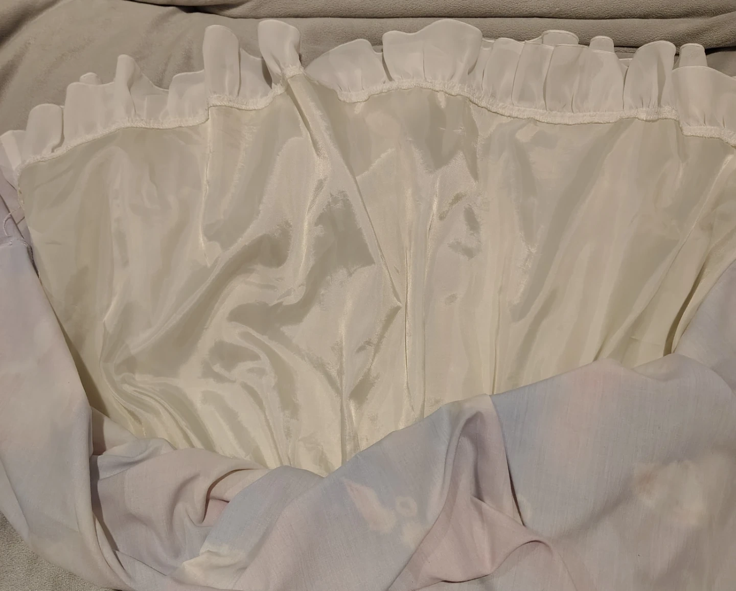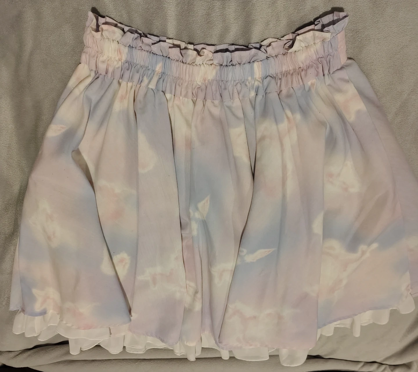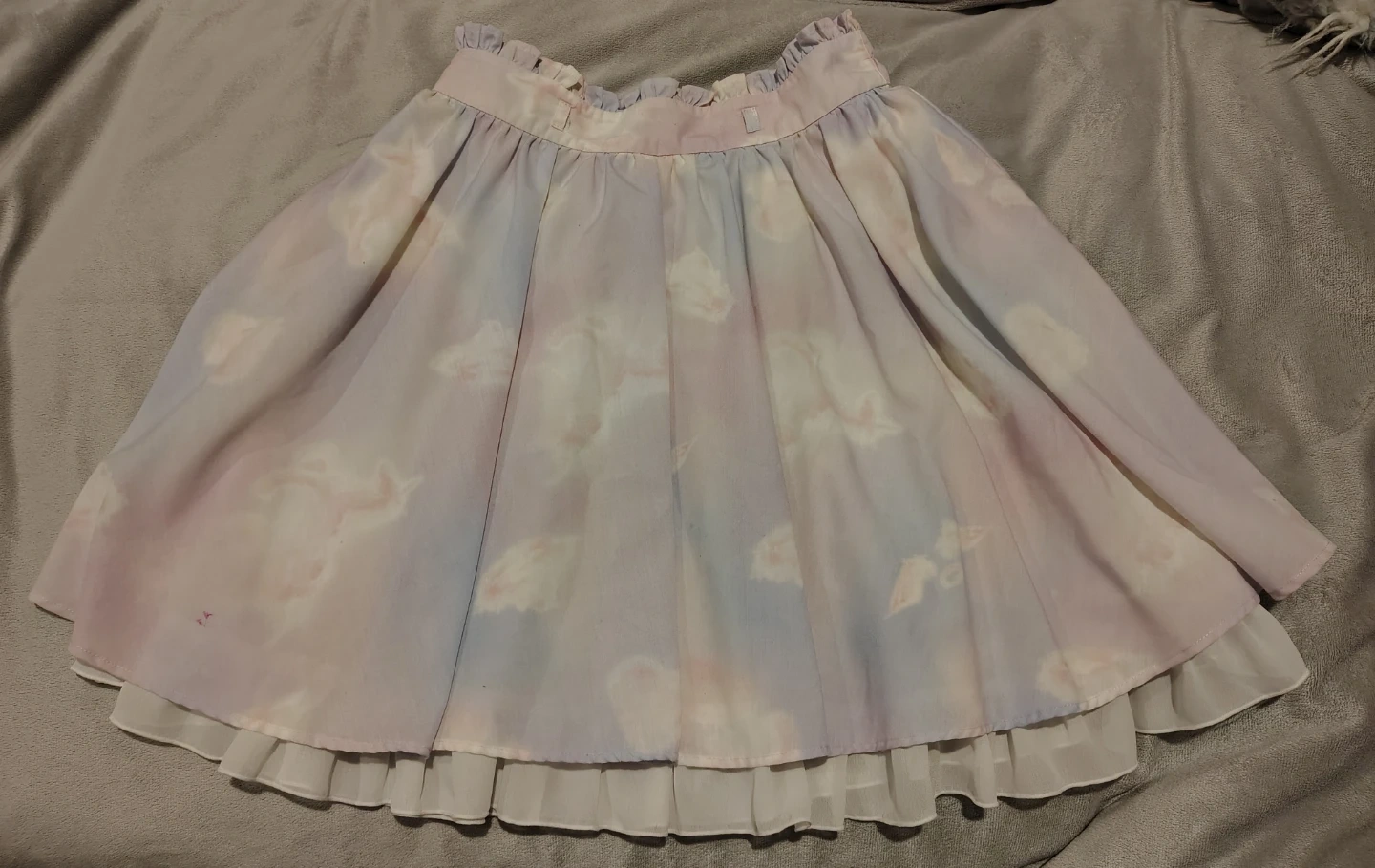 A cute skirt with a pastel cloud print. It features a ruffled waistband and a sheer hem with ruffled trim. There are some faint pink marks on the fabric, shown in picture but the skirt is so ruffled you don't see it. Has an underskirt which gives it lots of volume, no crinoline needed! Very cute coquette piece.