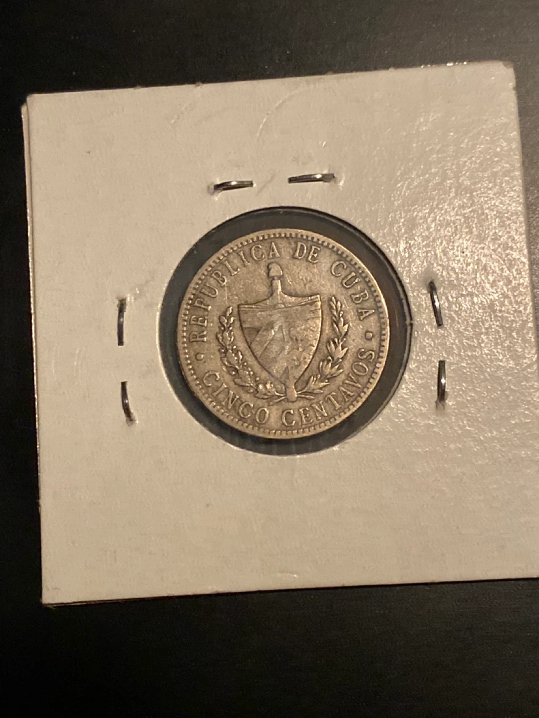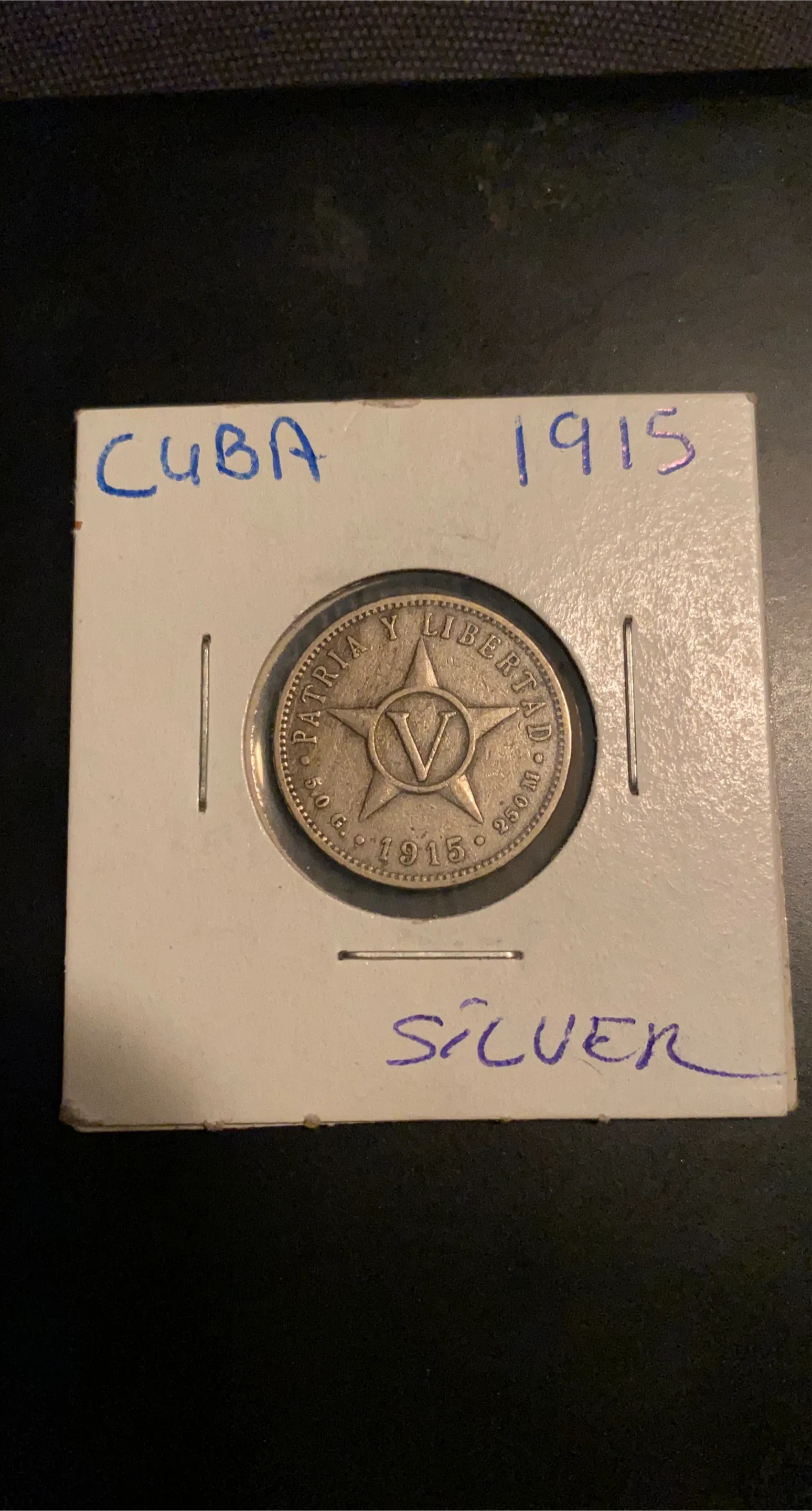 This is a silver coin from Cuba, minted in 1915. It's a Cinco Centavos denomination. The coin has 'Patria Y Libertad' on one side and the Cuban coat of arms on the other.