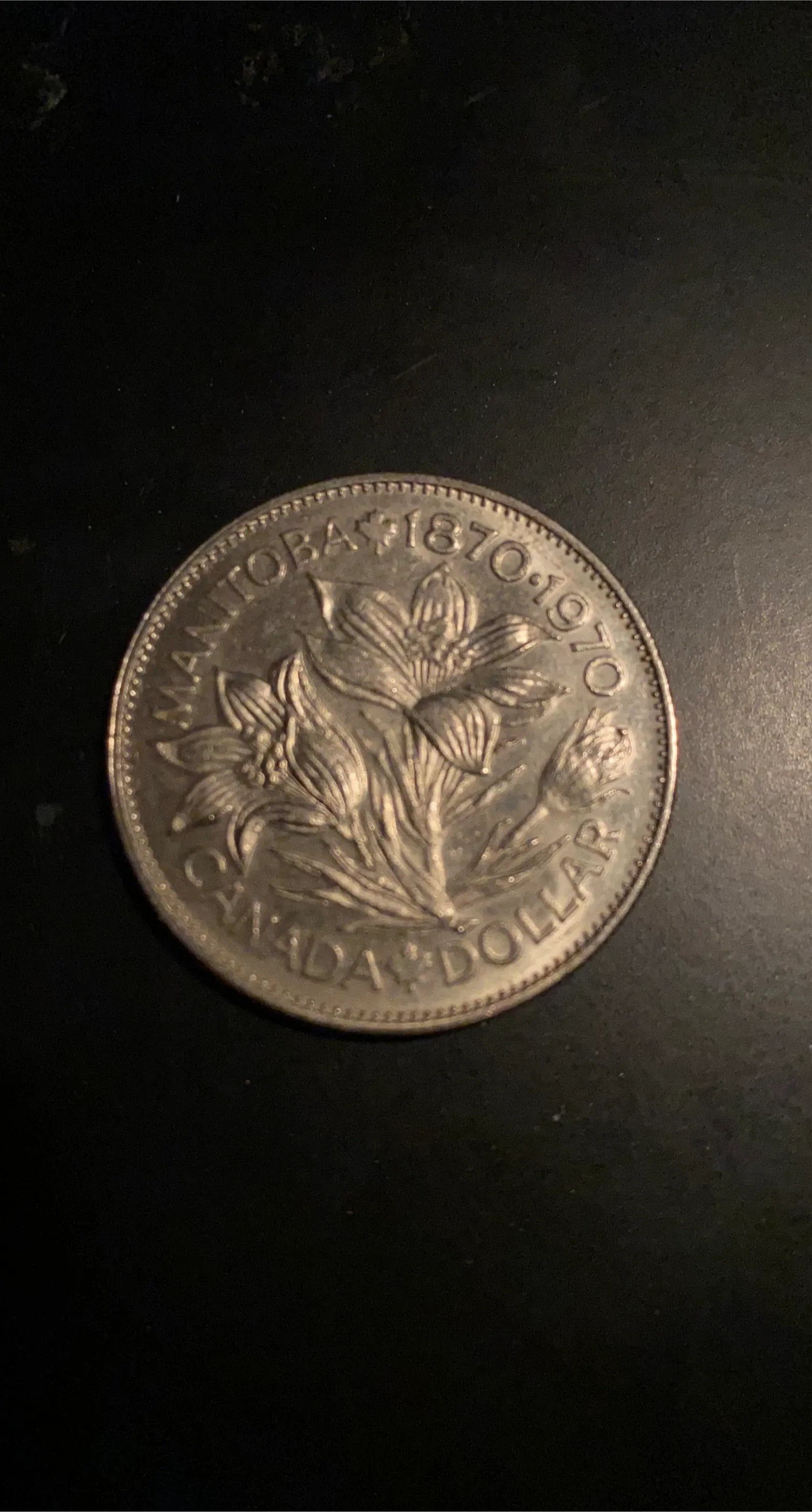 This is a 1970 Canadian dollar coin celebrating Manitoba's centennial. It features the provincial flower on one side and Queen Elizabeth II on the other. This coin is a great addition for collectors.