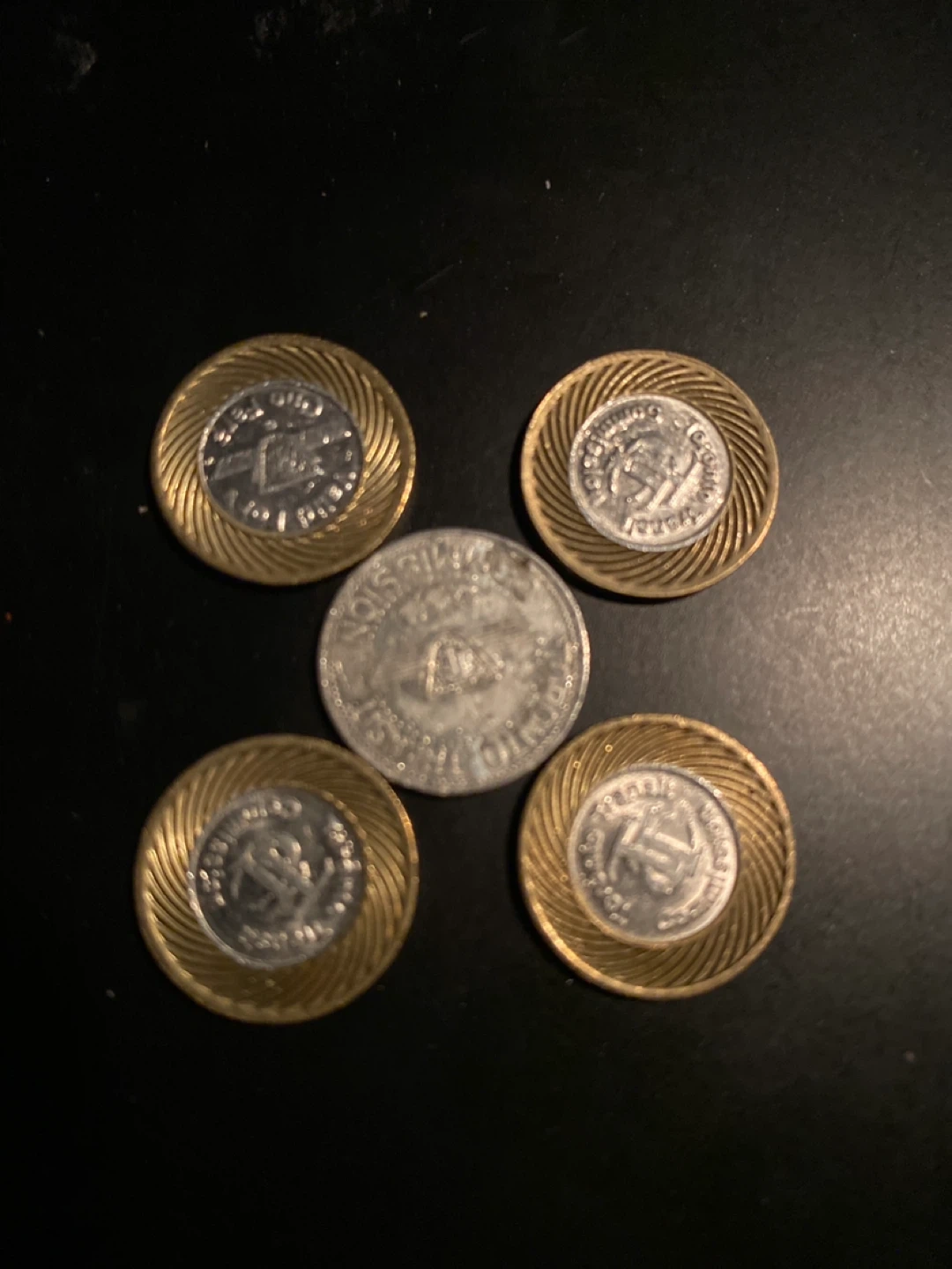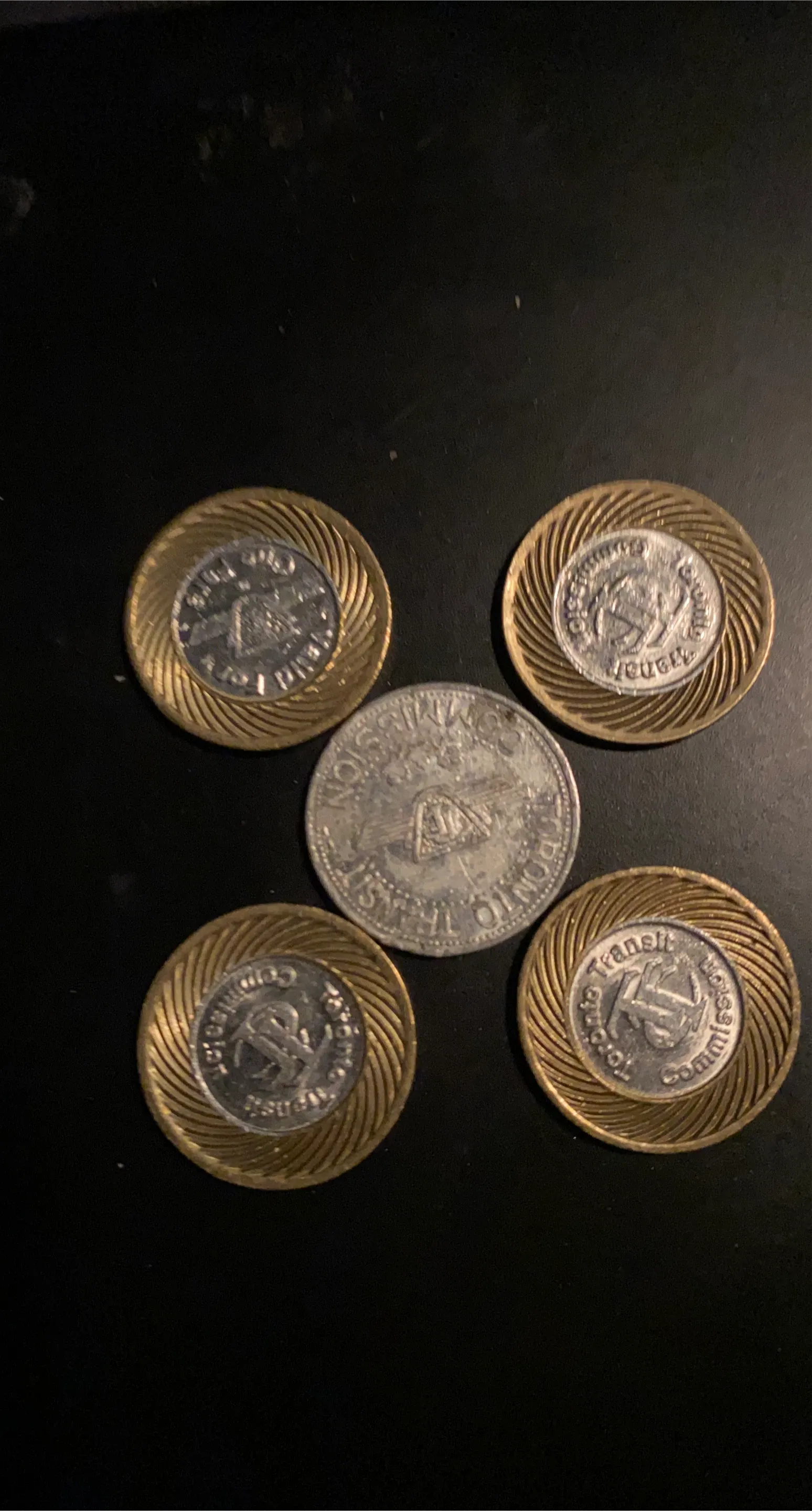 This is a set of five vintage Toronto Transit Commission (TTC) tokens. Four tokens have a gold-coloured outer rim with a silver-coloured centre, and one token is entirely silver-coloured. These tokens pre-date modern fare payment systems and are collectible items.