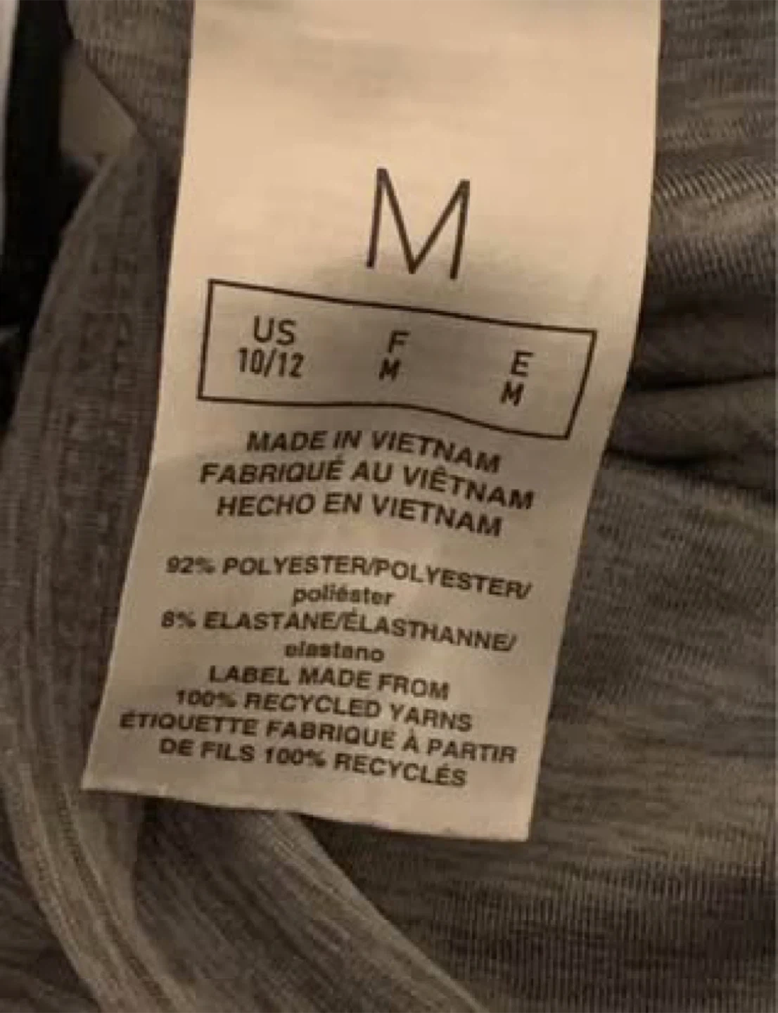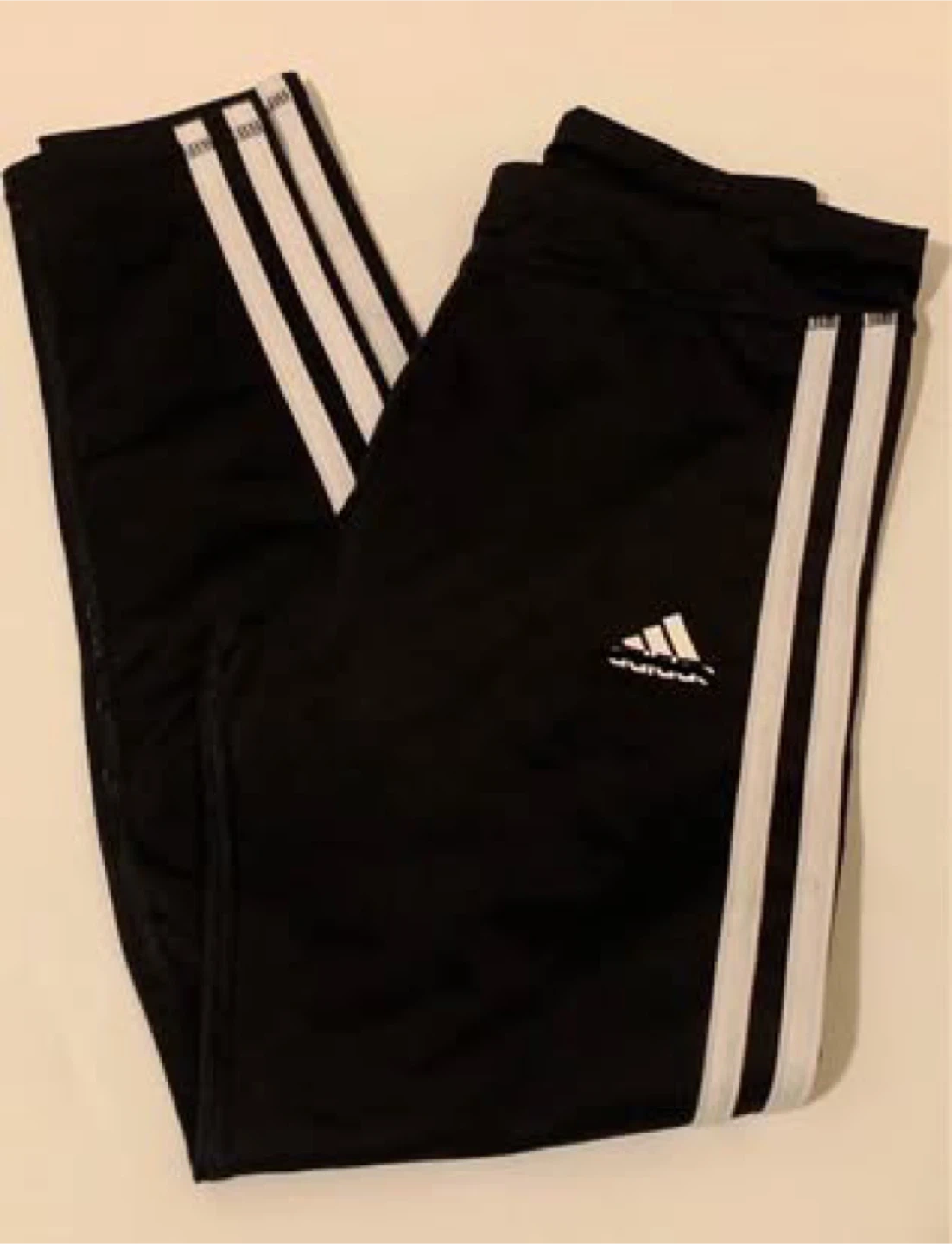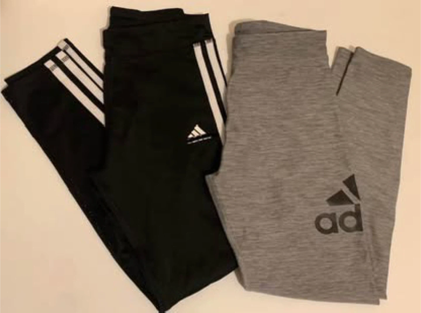 Two pairs of Adidas girl's leggings in black and grey, size medium. The black pair features white stripes and logo. The grey pair has a large brand logo. Both are made with a polyester and elastane blend for comfort and stretch. Made in Vietnam from 100% recycled yarns for the labels. Super comfy for active days or just chilling. No rips or stains.