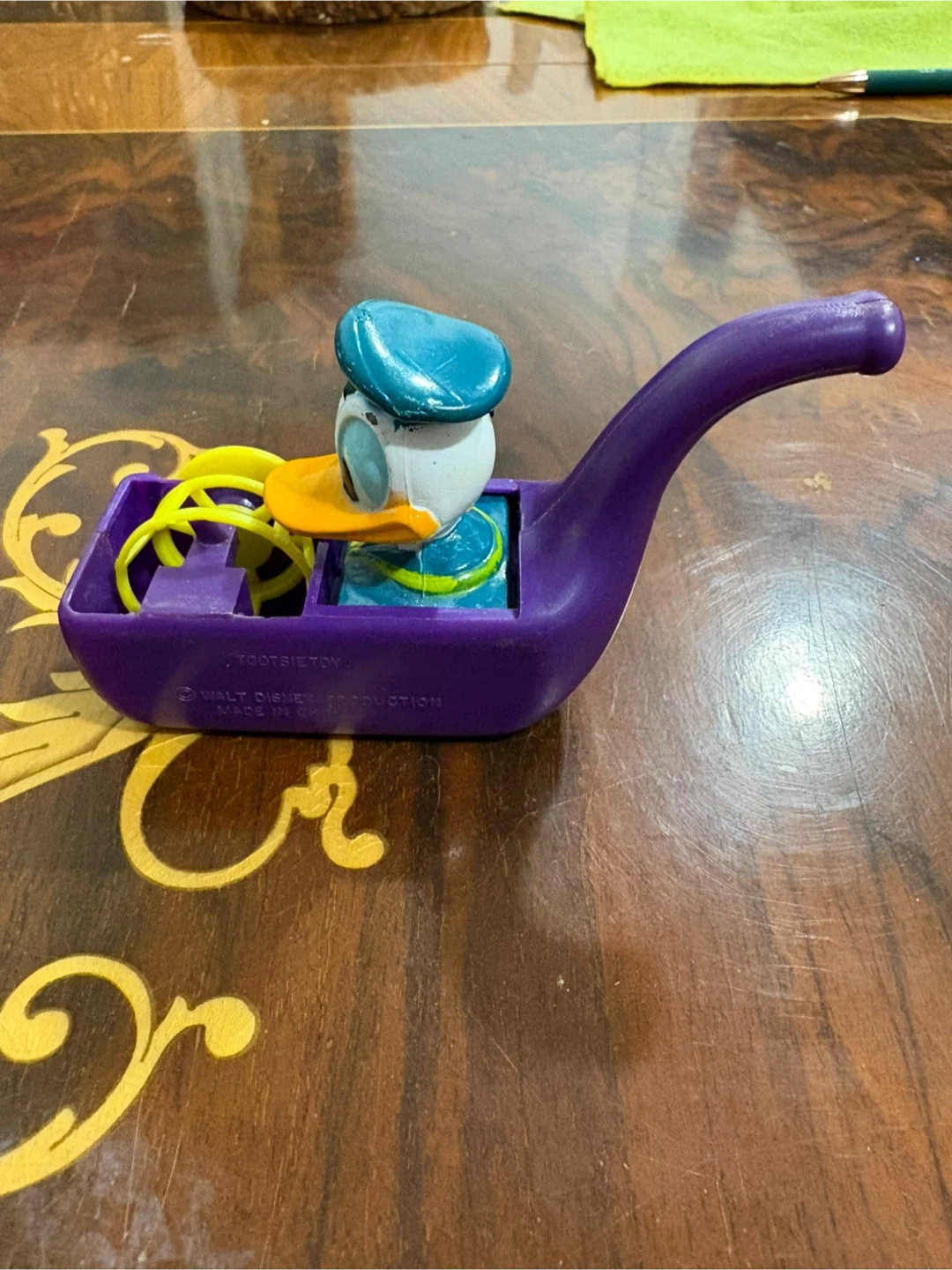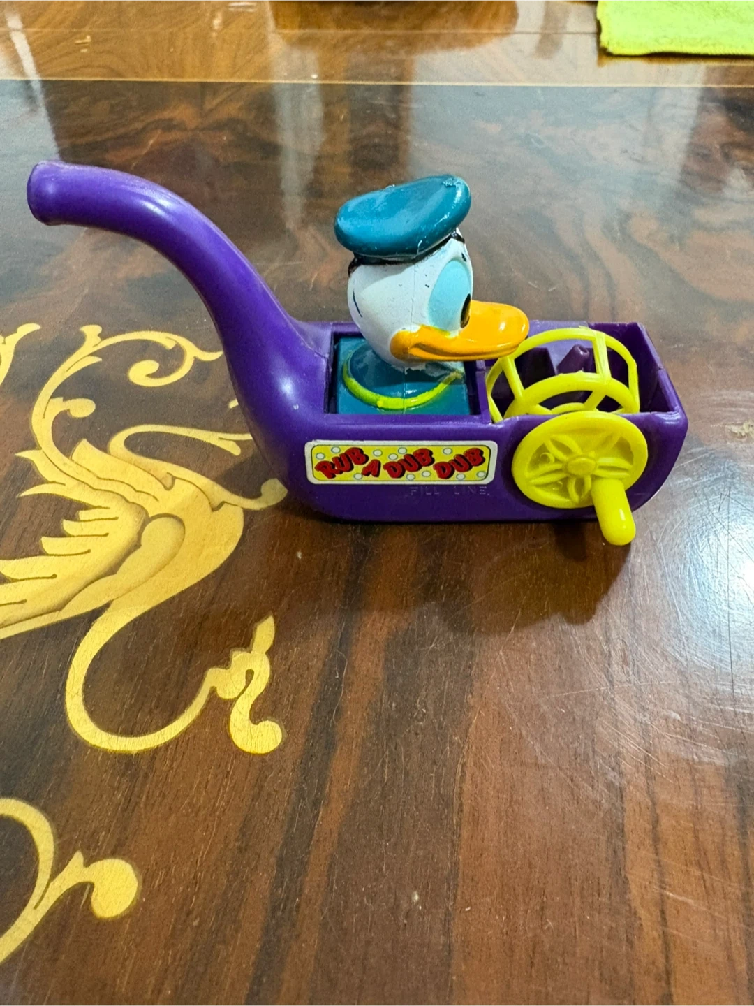 This is a vintage Donald Duck bubble toy made by TootsieToy and licensed by Walt Disney Productions. It's a fun, classic toy for collectors or young children.