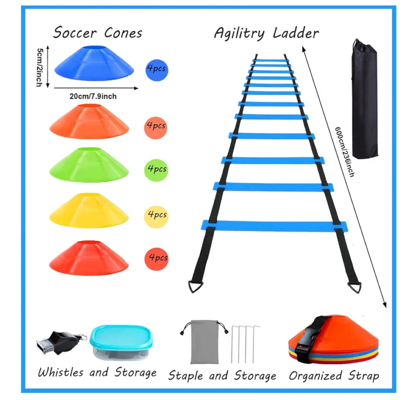 Includes two soccer balls, a black hand pump with needle, and a set of blue agility cones. A black drawstring bag is also included to carry the equipment. This set is great for practice drills and conditioning. Ball material is synthetic.
