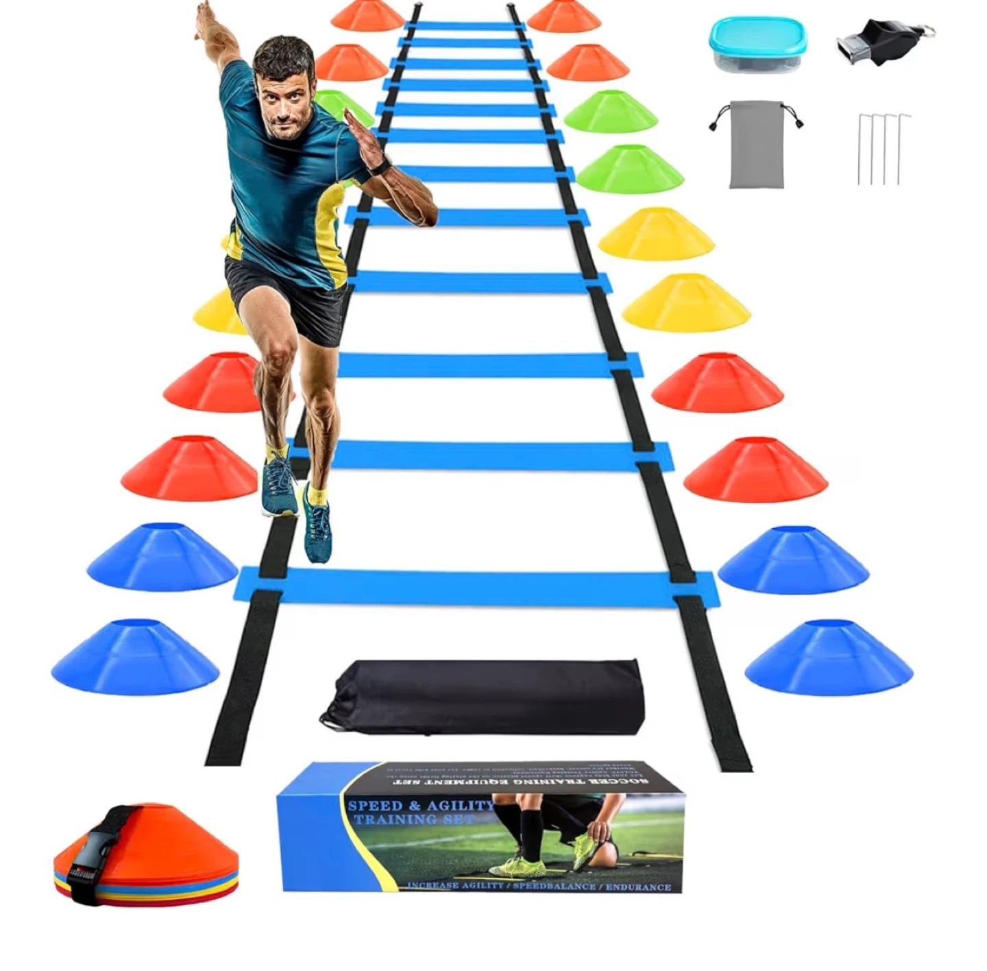 Includes two soccer balls, a black hand pump with needle, and a set of blue agility cones. A black drawstring bag is also included to carry the equipment. This set is great for practice drills and conditioning. Ball material is synthetic.