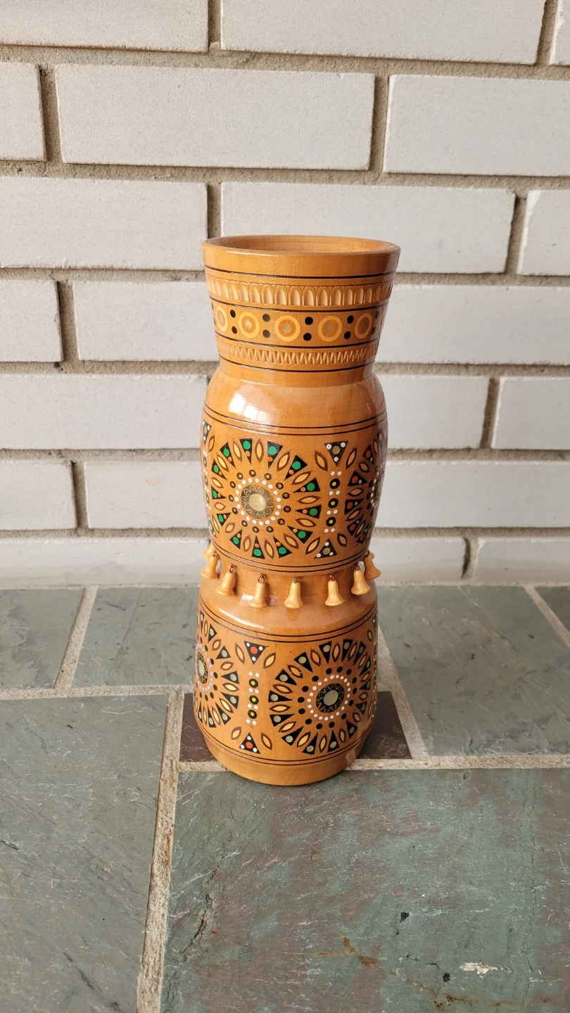 Handcrafted vase with delicate inlay patterns of wood, mother of pearl and seed beads. By artisans in the Carpathian mountains.