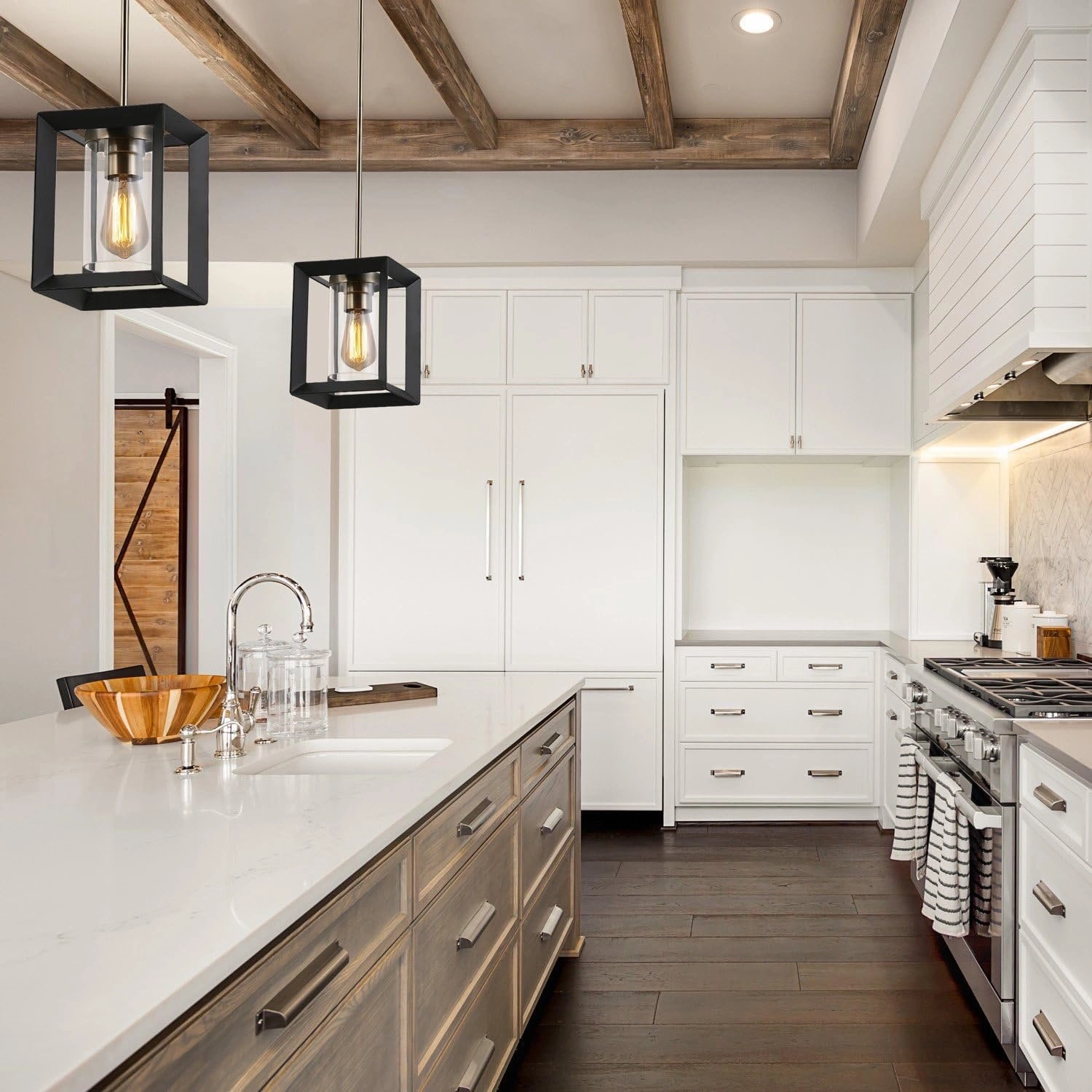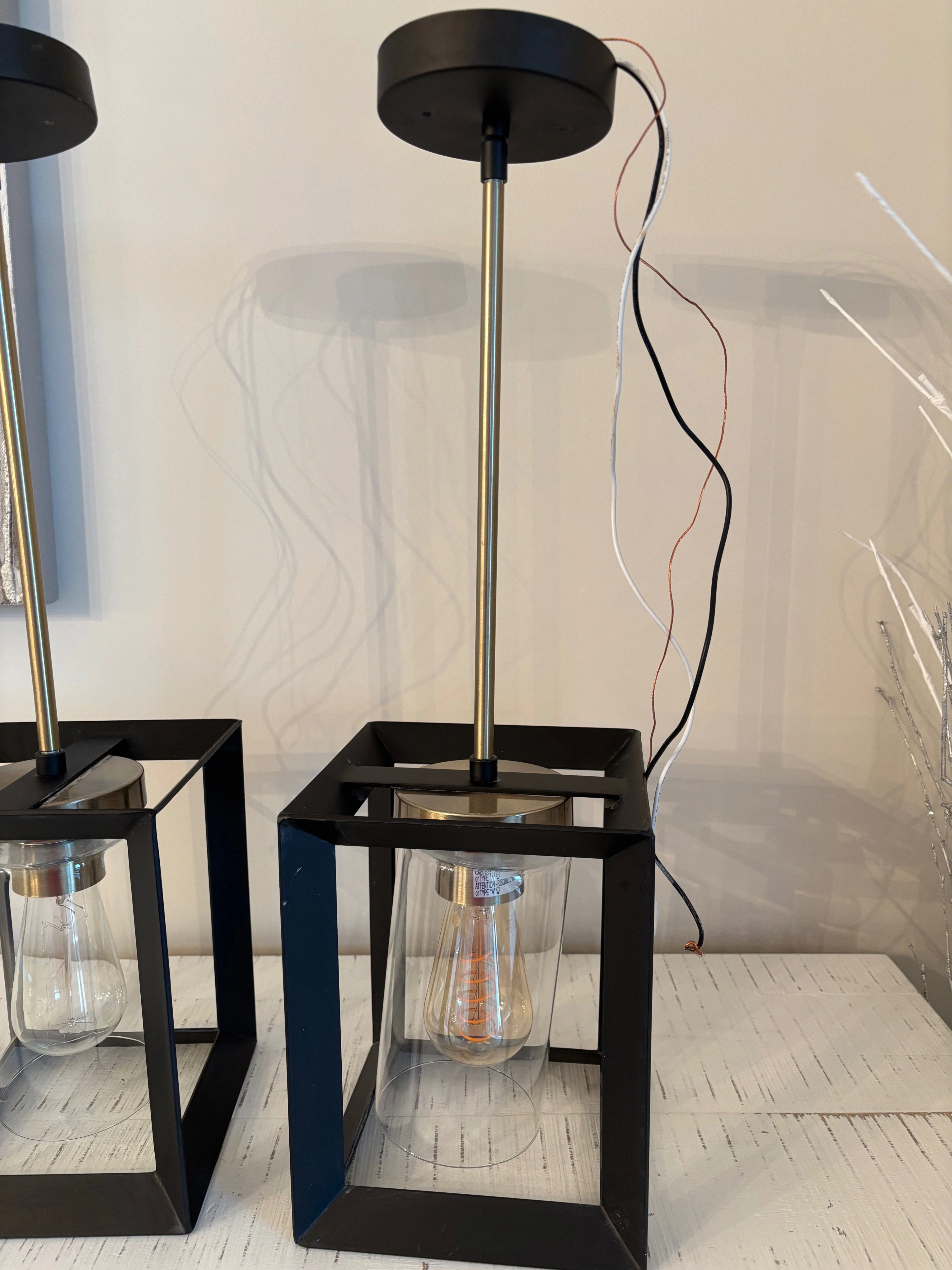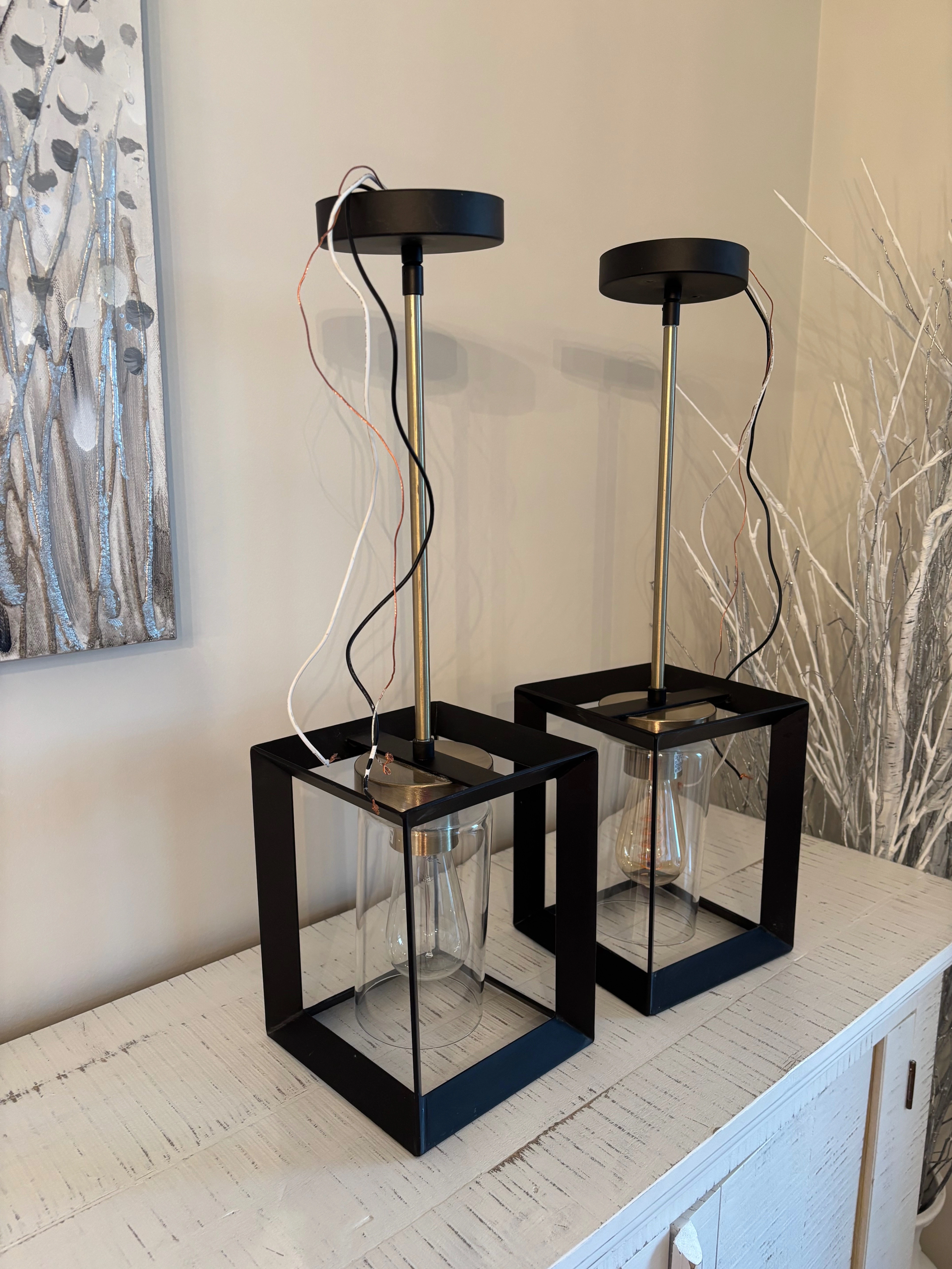 Beautiful,solid, well made - black metal pendant lights, lantern style. Light is surrounded by glass.