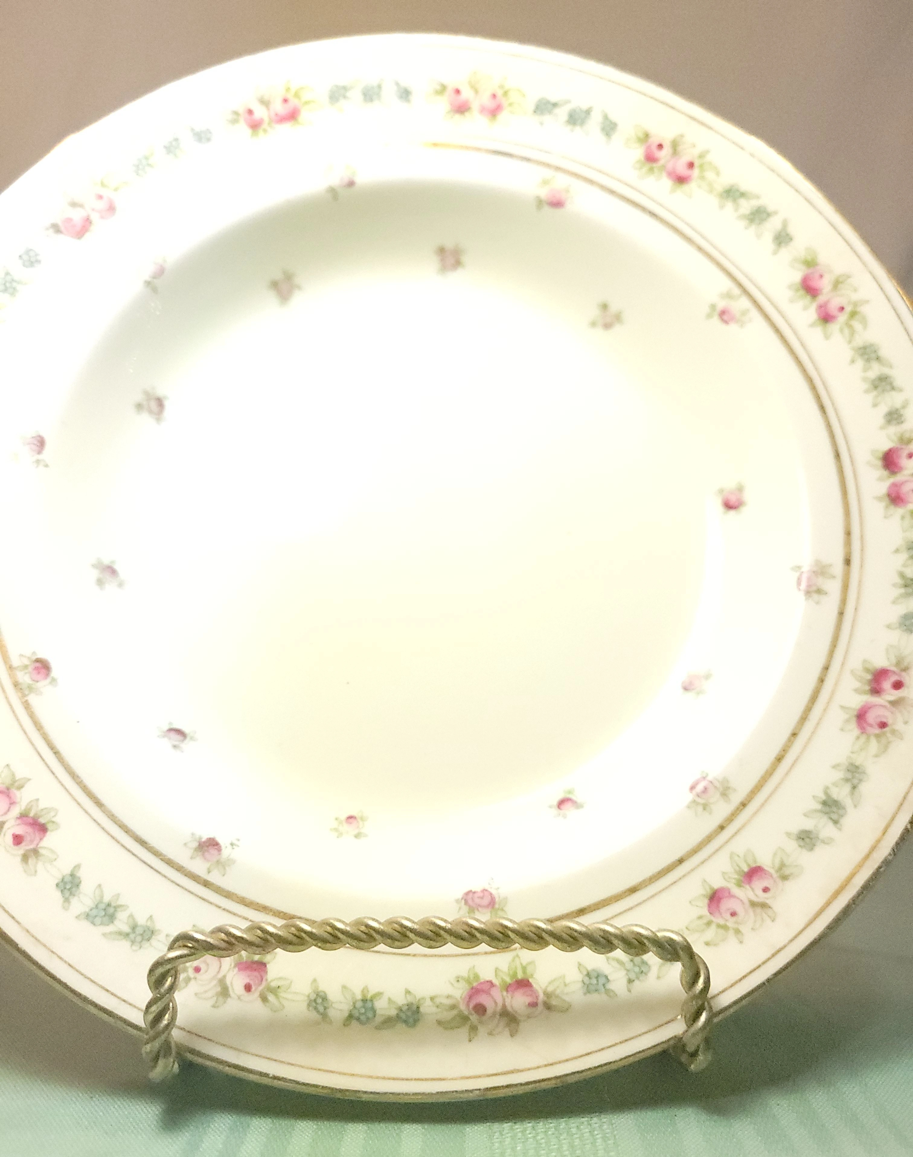 Stunning antique rimmed bowl (soup/pasta style) by Bishop & Stonier, one of the premier Staffordshire potteries of the Edwardian era. This piece features a delicate transferware pattern of soft pink rose clusters, small blue accent blossoms, and detailed green foliage on a crisp white semi-porcelain body. The rim is gently scalloped with an elegant, lightly weathered gold-gilt edge.