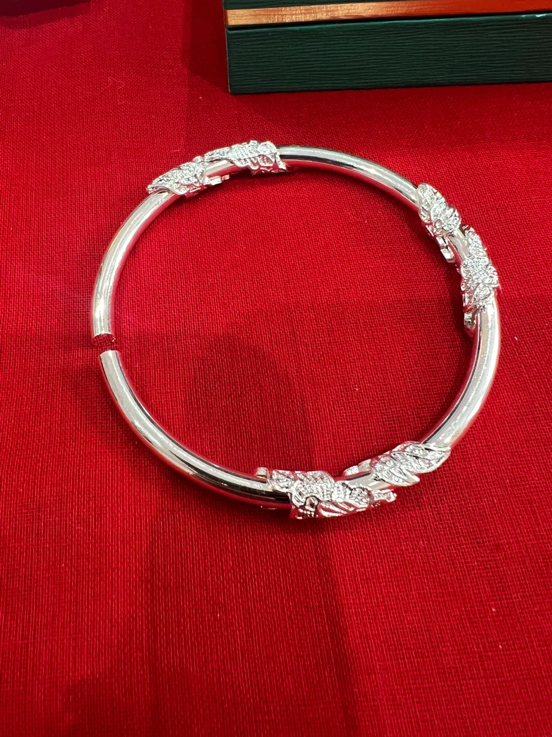 This silve bangle bracelet features a beautiful leaf design. It's a stylish accessory for any occasion. The bracelet has an opening for easy wear.