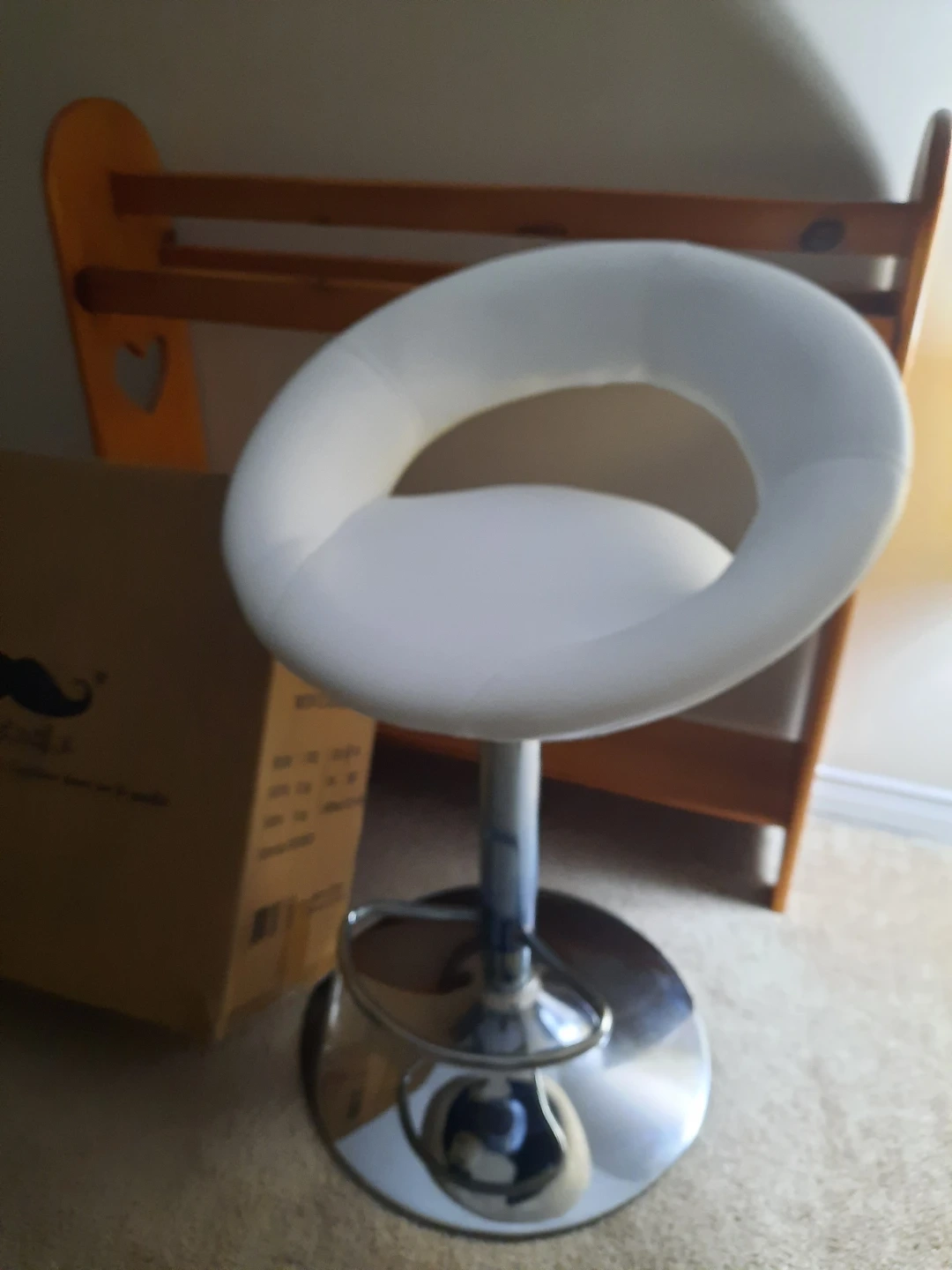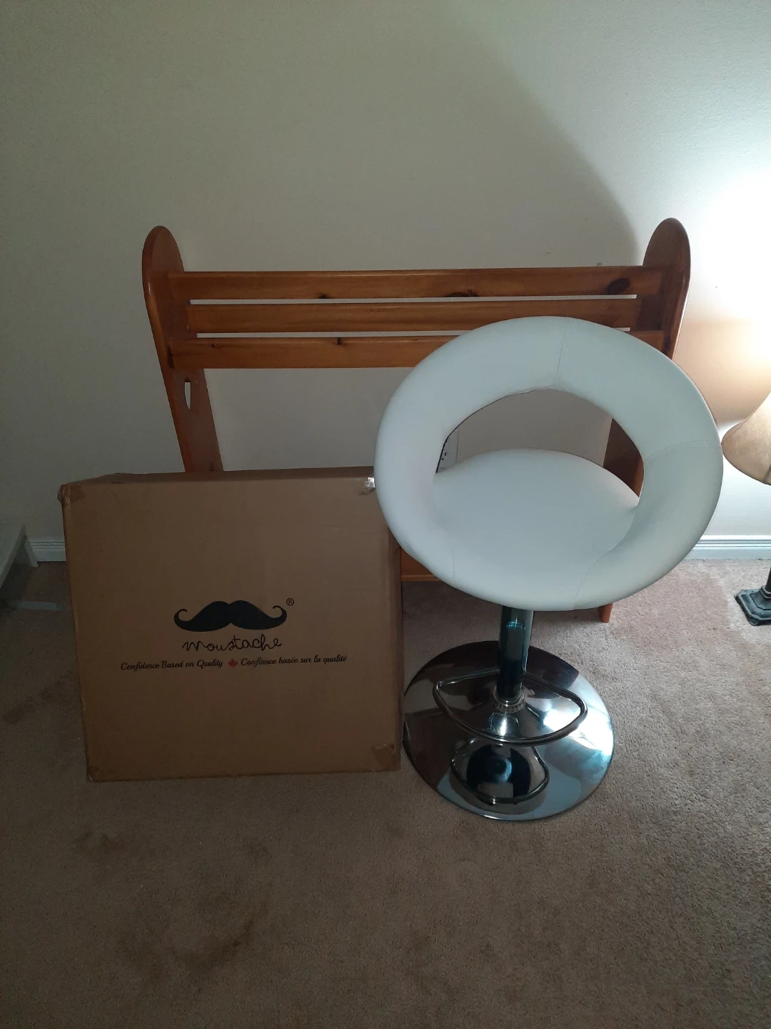 This Moustache bar stool features a white PU leather seat with a chrome base. It's adjustable in height and swivels 360 degrees. Includes original box and hardware. Originally $125 will sell for $75 each.