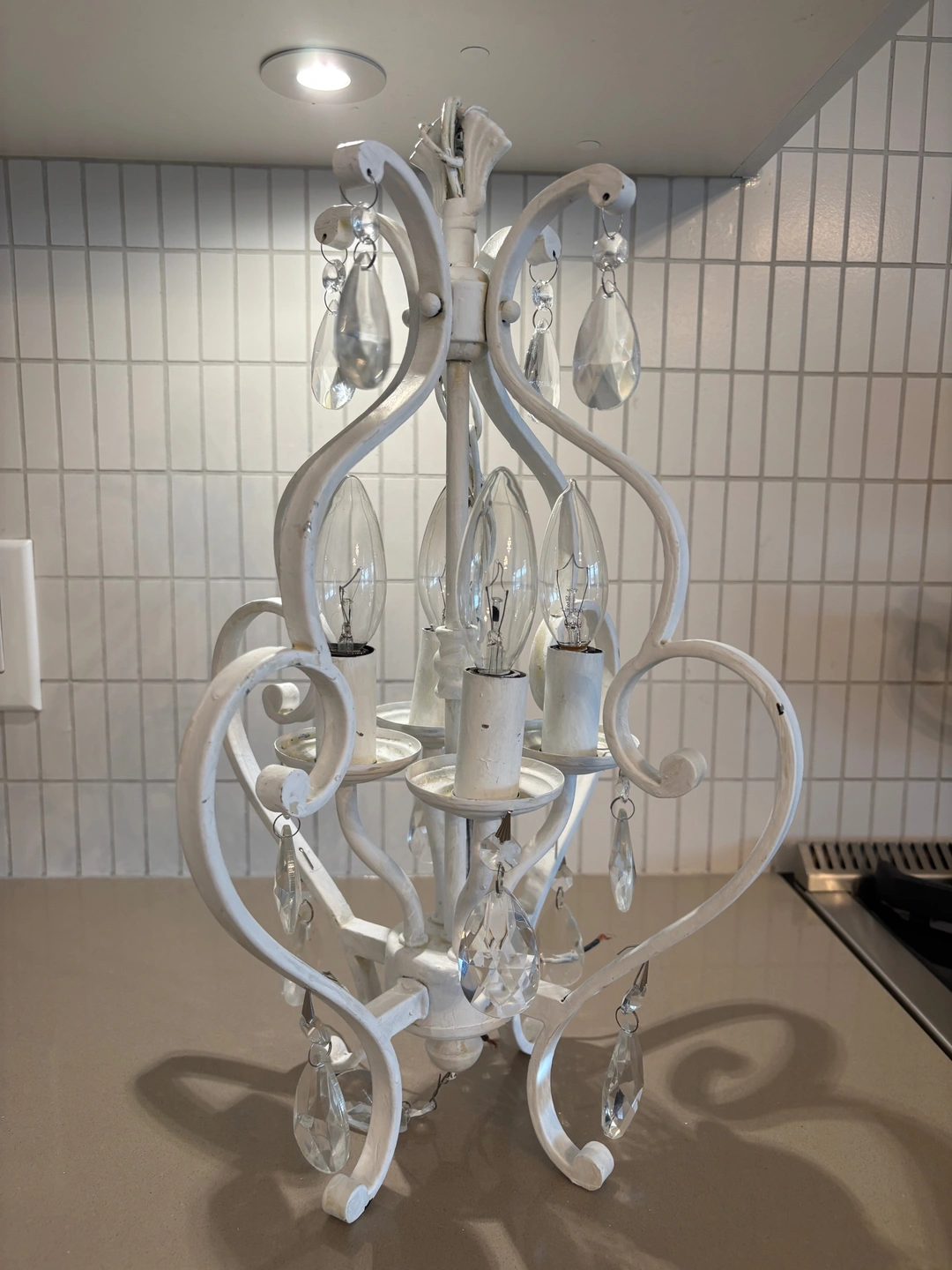 Distressed white metal crystal chandelier