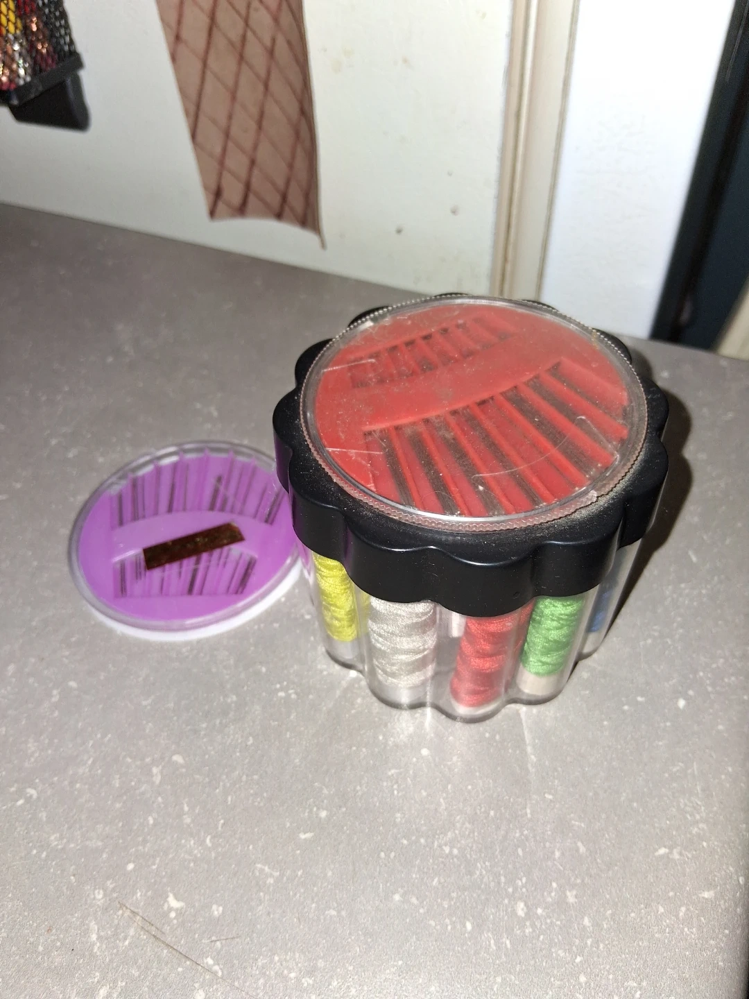 Compact sewing kit containing multiple spools of thread in various colours. It also includes a separate container of sewing needles. Great for quick repairs or travel sewing needs!