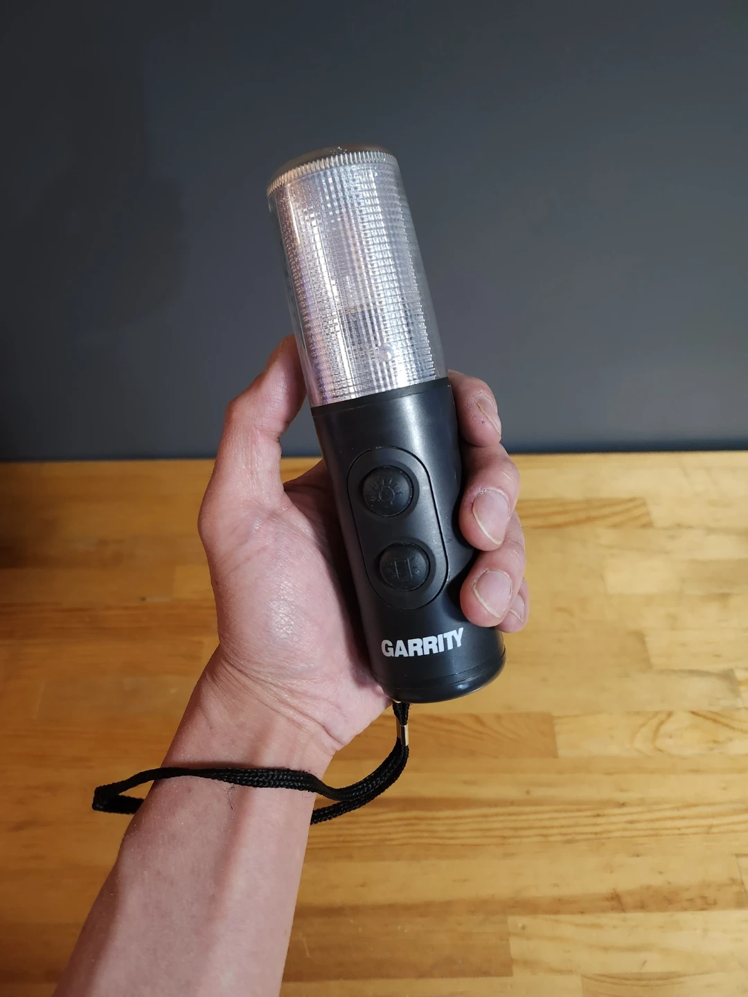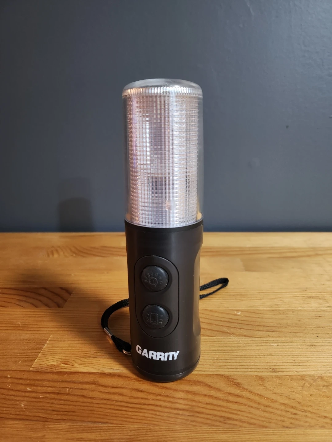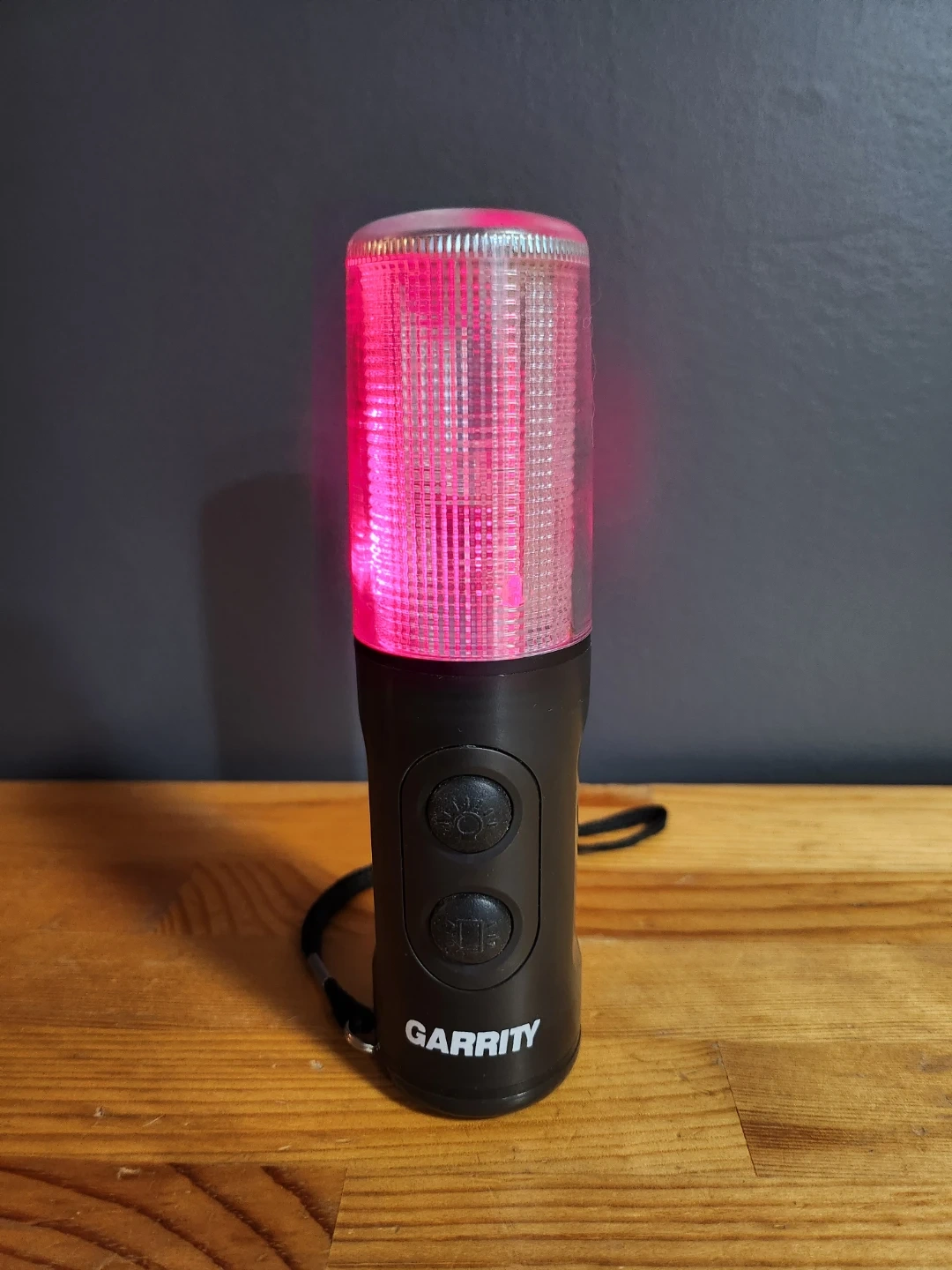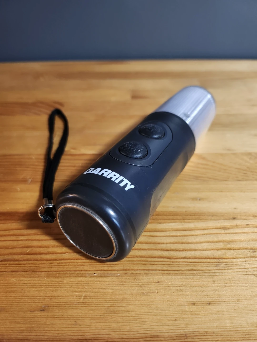Garrity Emergency Flashlight. Part of the multi-function safety line designed for versatility in various situations. Key Features: - Operation: Features easy-to-operate two-button control for cycling through different light modes. - Power Source: The device operates on two AA alkaline batteries. - Lighting Modes: 2 modes, It offers a main Light beam and a side red flashing beam for emergencies. - Hands-Free Use: A magnetic base allows for hands-free use by attaching it to metal surfaces. - Portability: Lightweight, compact, and includes a clip-off wrist lanyard.