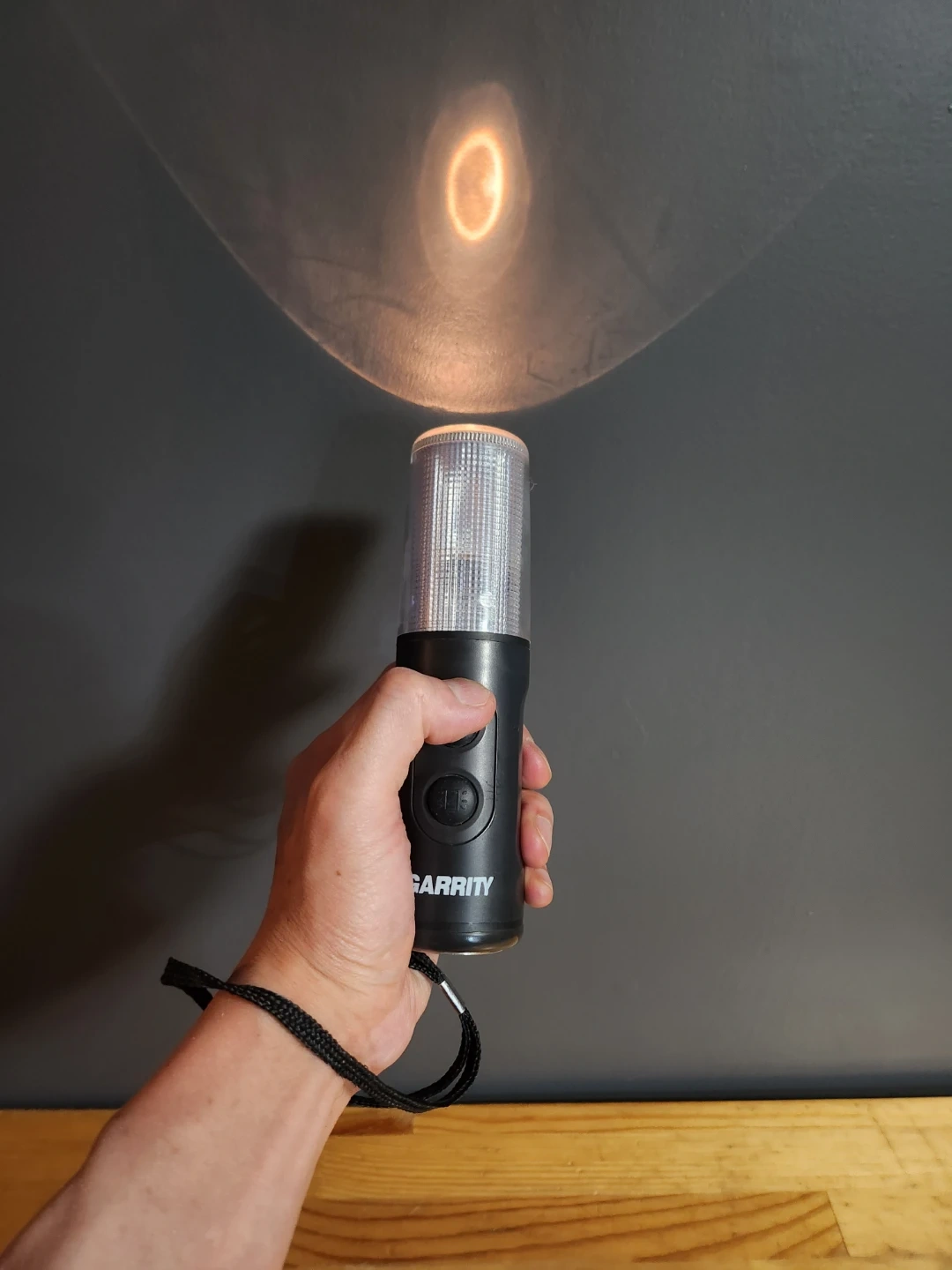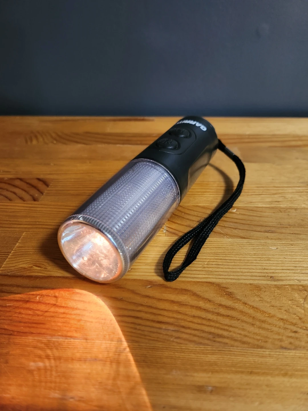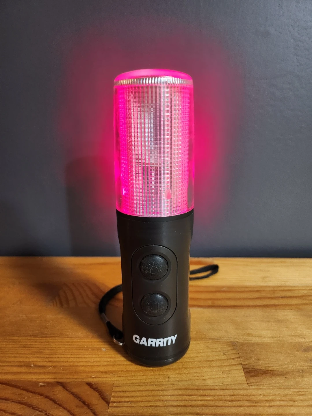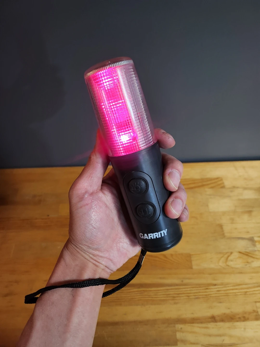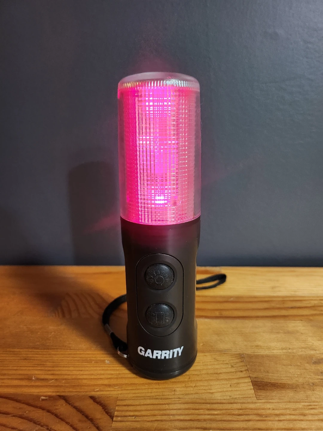 Garrity Emergency Flashlight. Part of the multi-function safety line designed for versatility in various situations. Key Features: - Operation: Features easy-to-operate two-button control for cycling through different light modes. - Power Source: The device operates on two AA alkaline batteries. - Lighting Modes: 2 modes, It offers a main Light beam and a side red flashing beam for emergencies. - Hands-Free Use: A magnetic base allows for hands-free use by attaching it to metal surfaces. - Portability: Lightweight, compact, and includes a clip-off wrist lanyard.