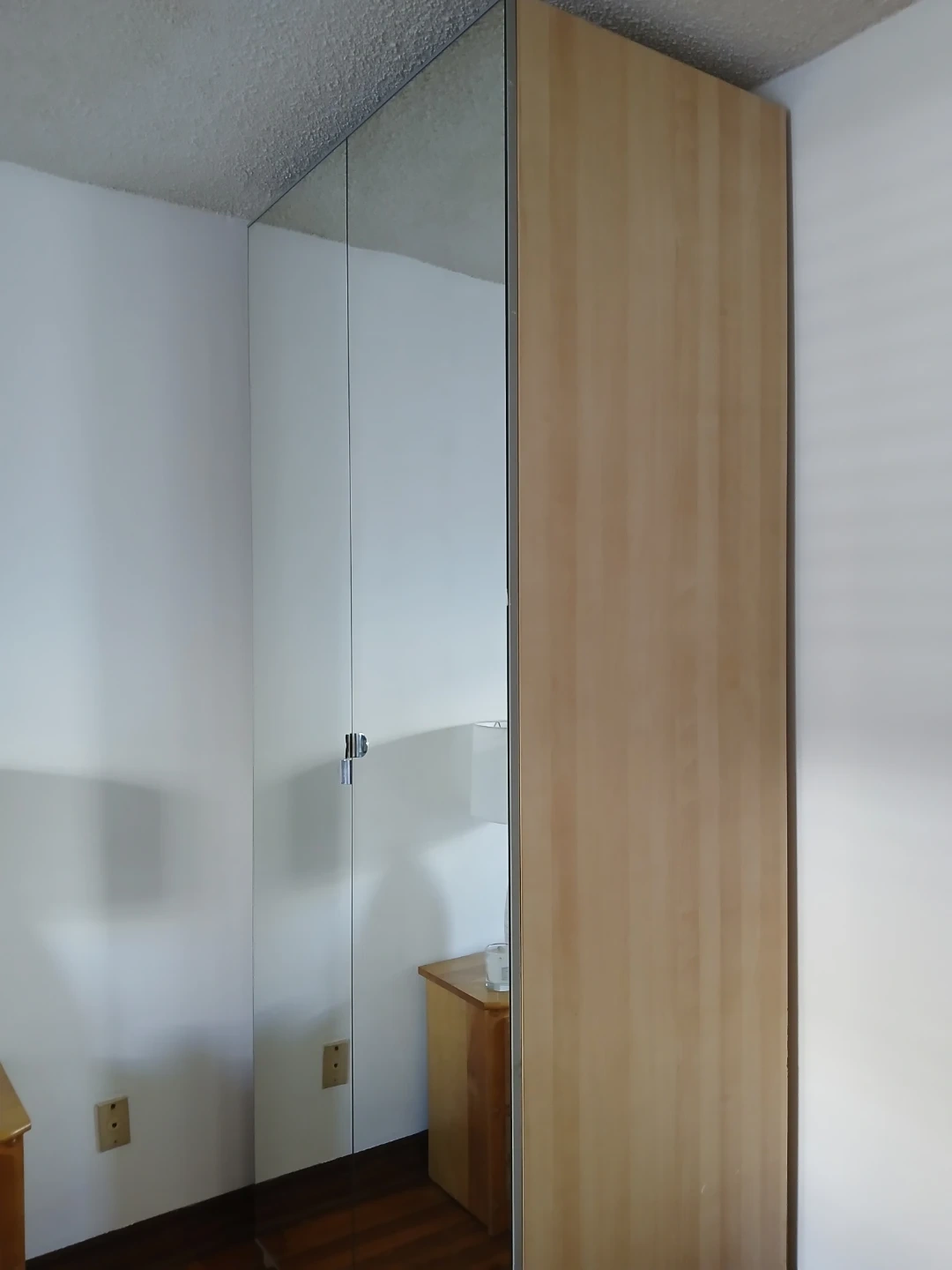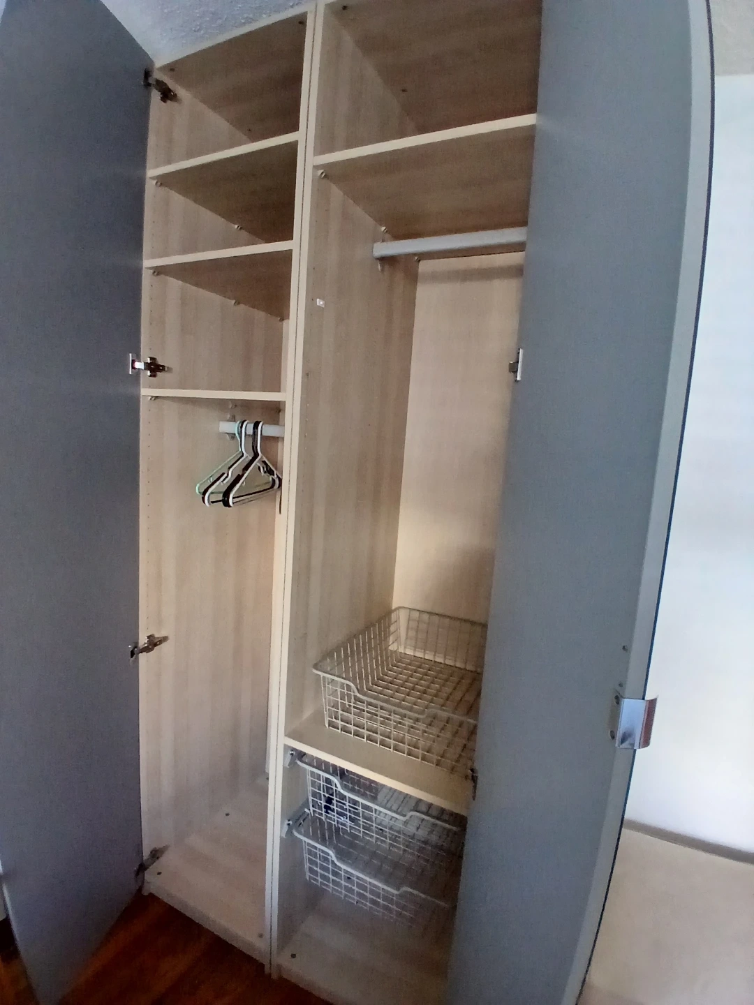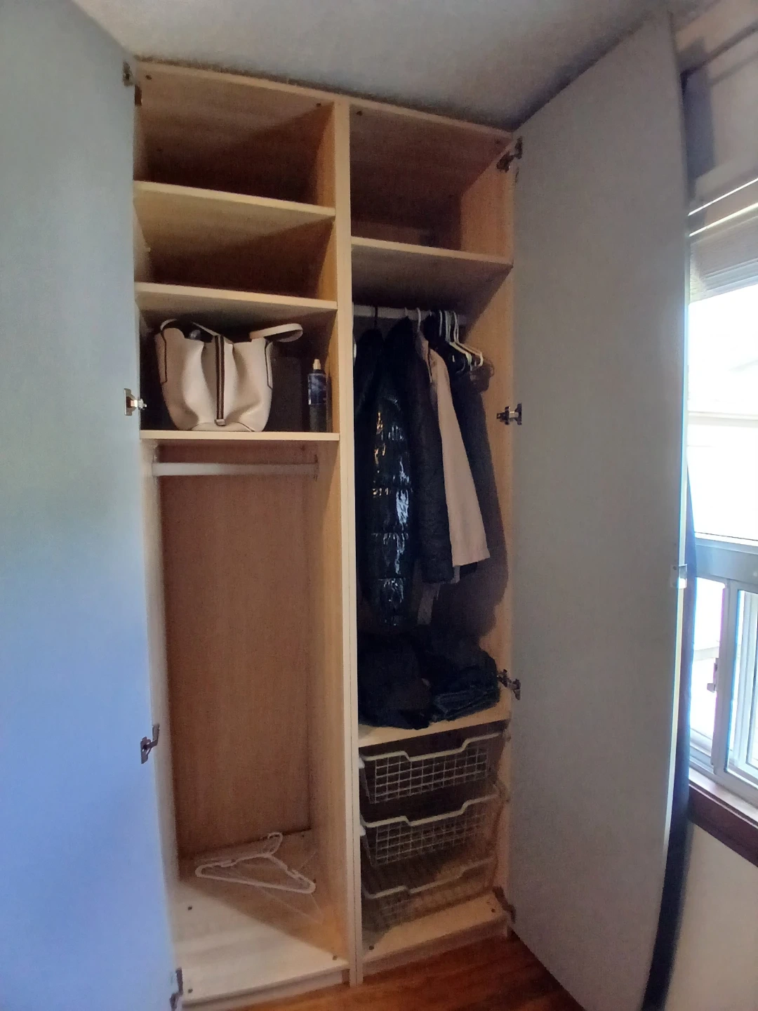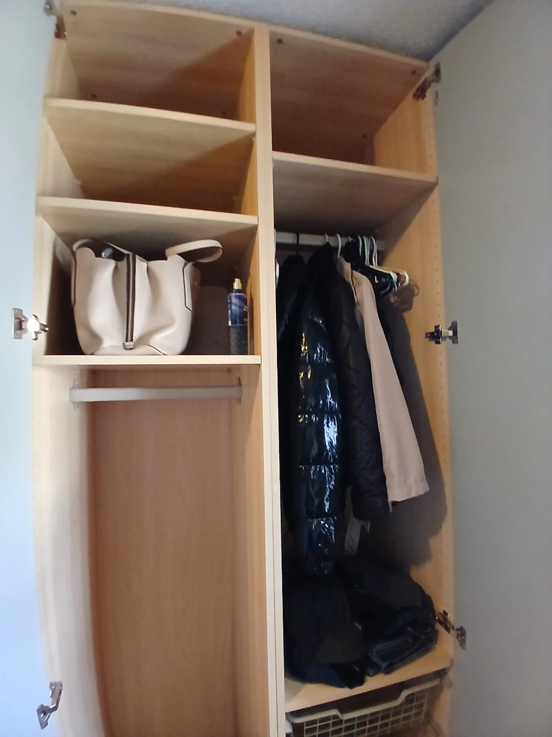In excellent condition. Light wood colour with mirror on door. Comes with hanging bar and shelves/drawers seen in photo.