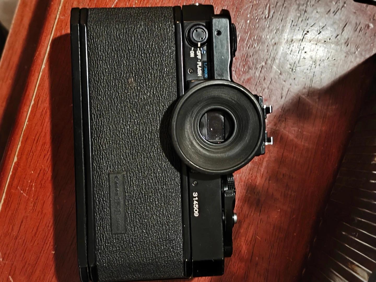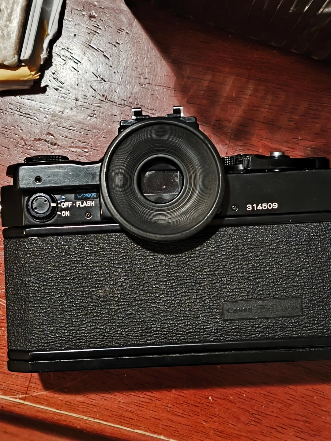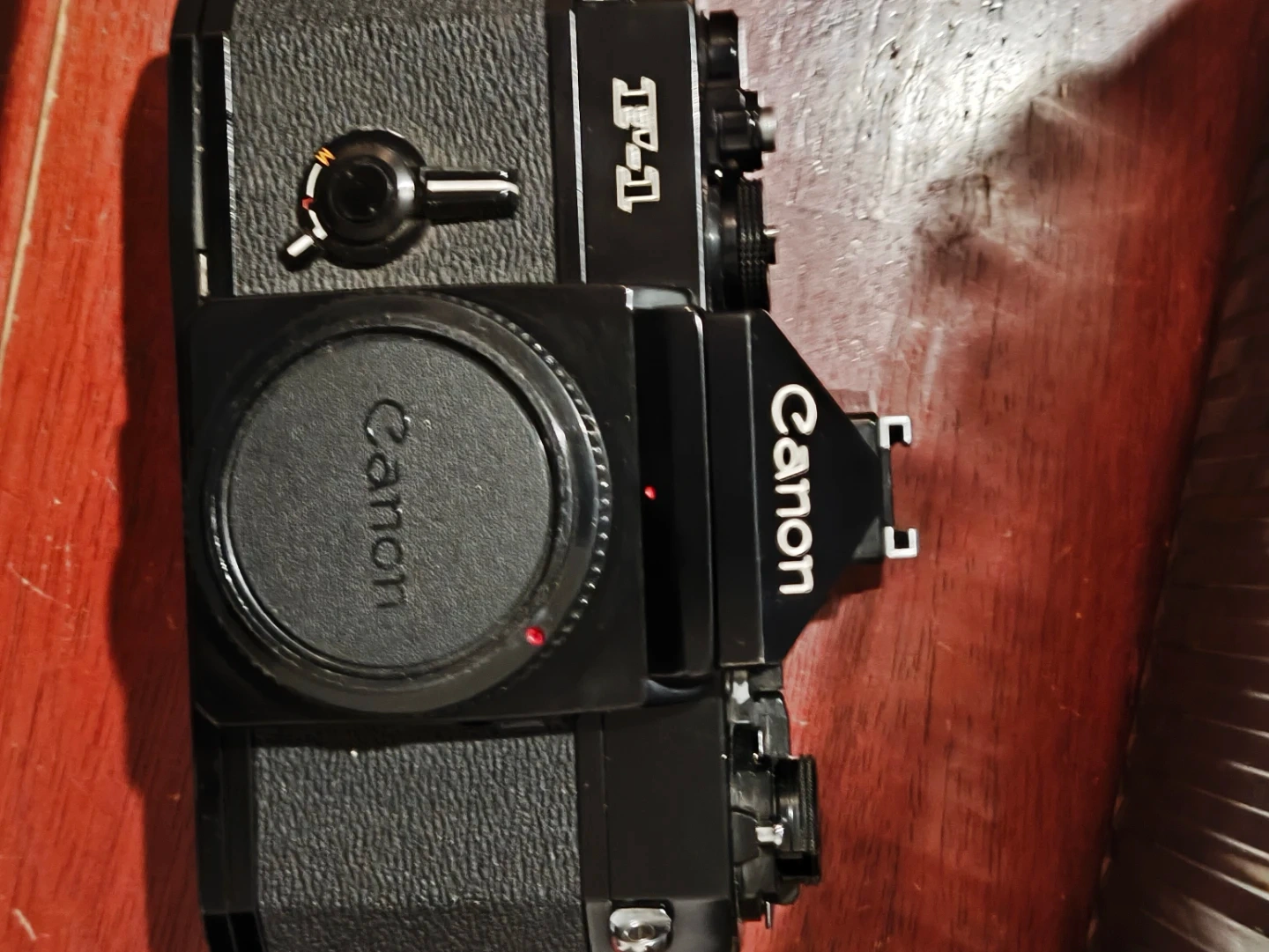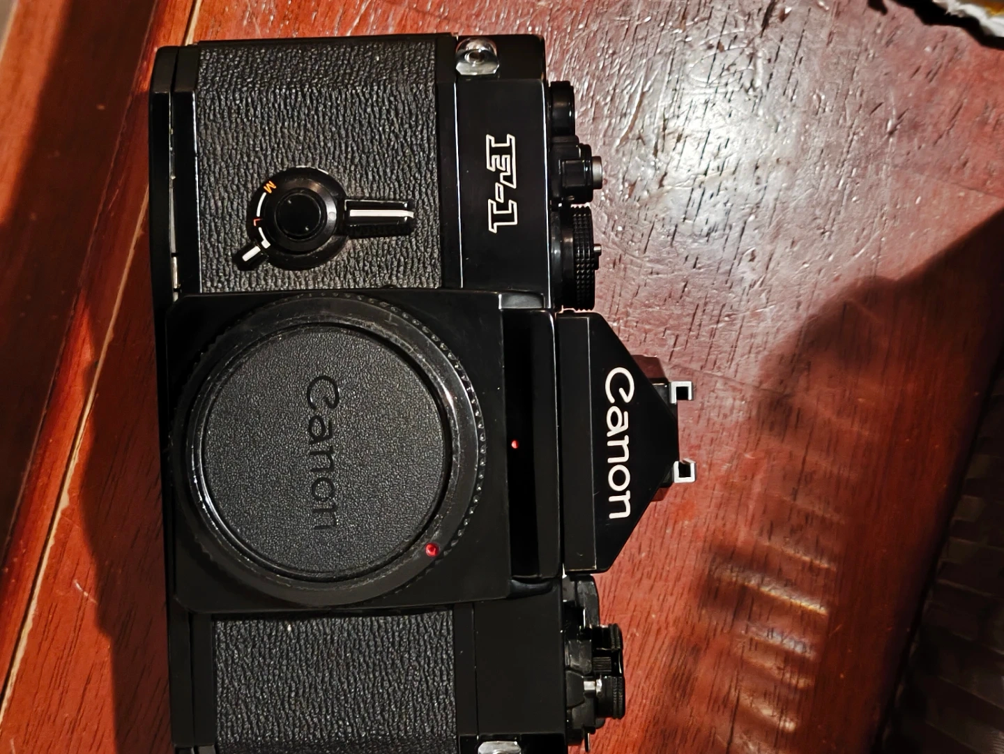 This is a black Canon F-1 camera. It's a 35mm SLR film camera. It's good for photographers looking to get into film photography!
