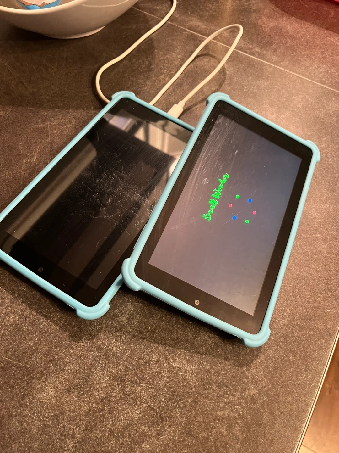 I have two 10” kids tablets purchased from Amazon with blue cases designed for kids. Each case features a built-in kickstand for hands-free viewing. Great for travel or home use! My kids loved them just don’t use them anymore. $20 each obo