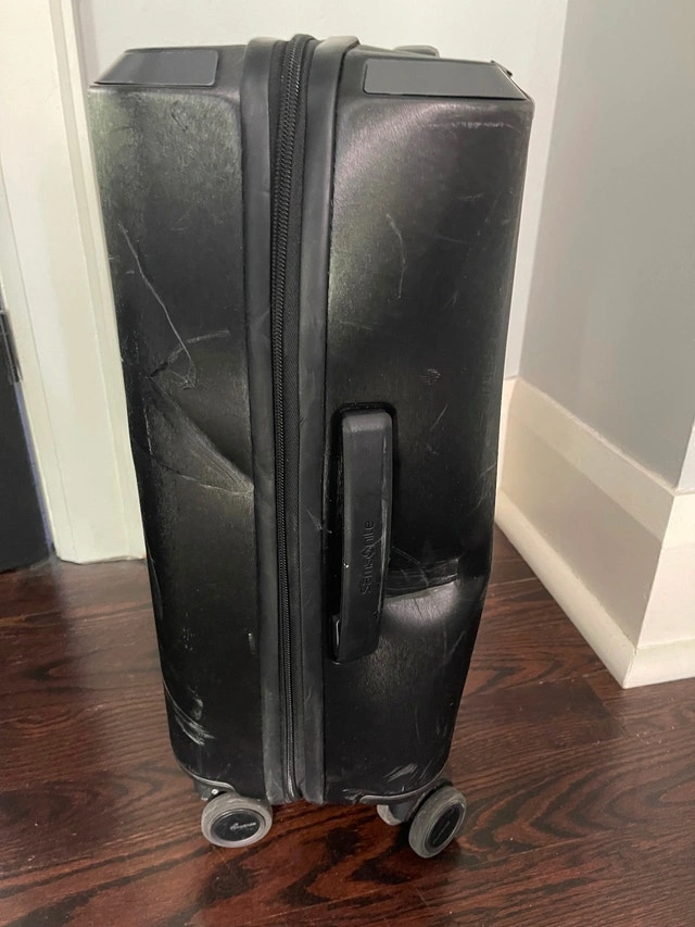 Unfortunately, the airlines caused some superficial damage on its last trip: scratches on the front, a dent on the back, and a metal decorative piece on top that needs to be glued down. Please see photos for reference.