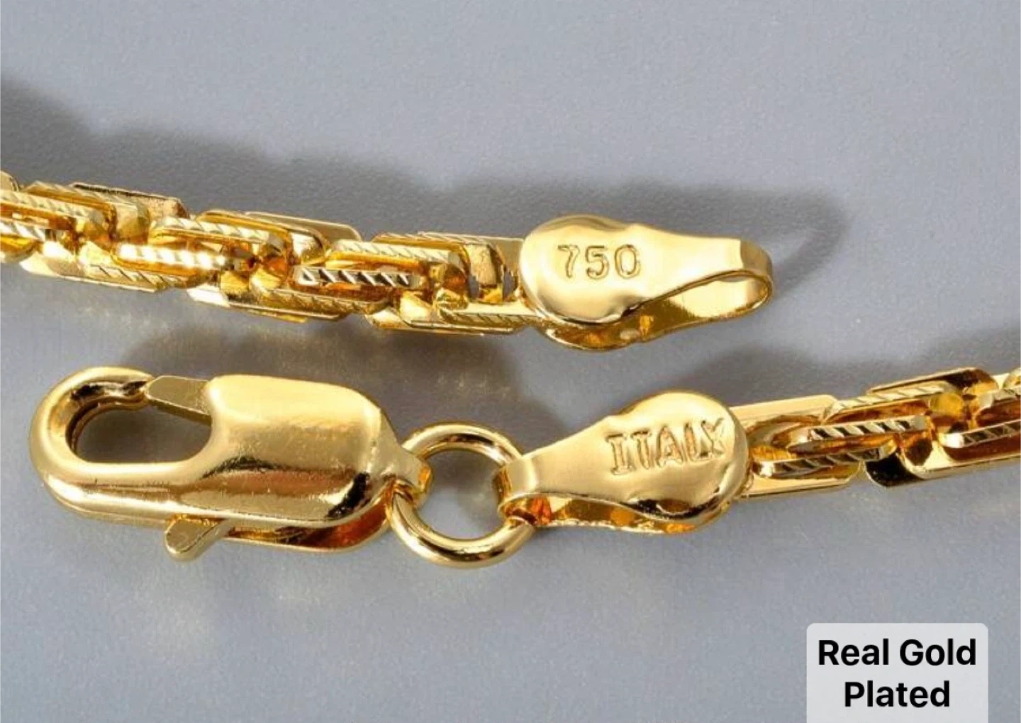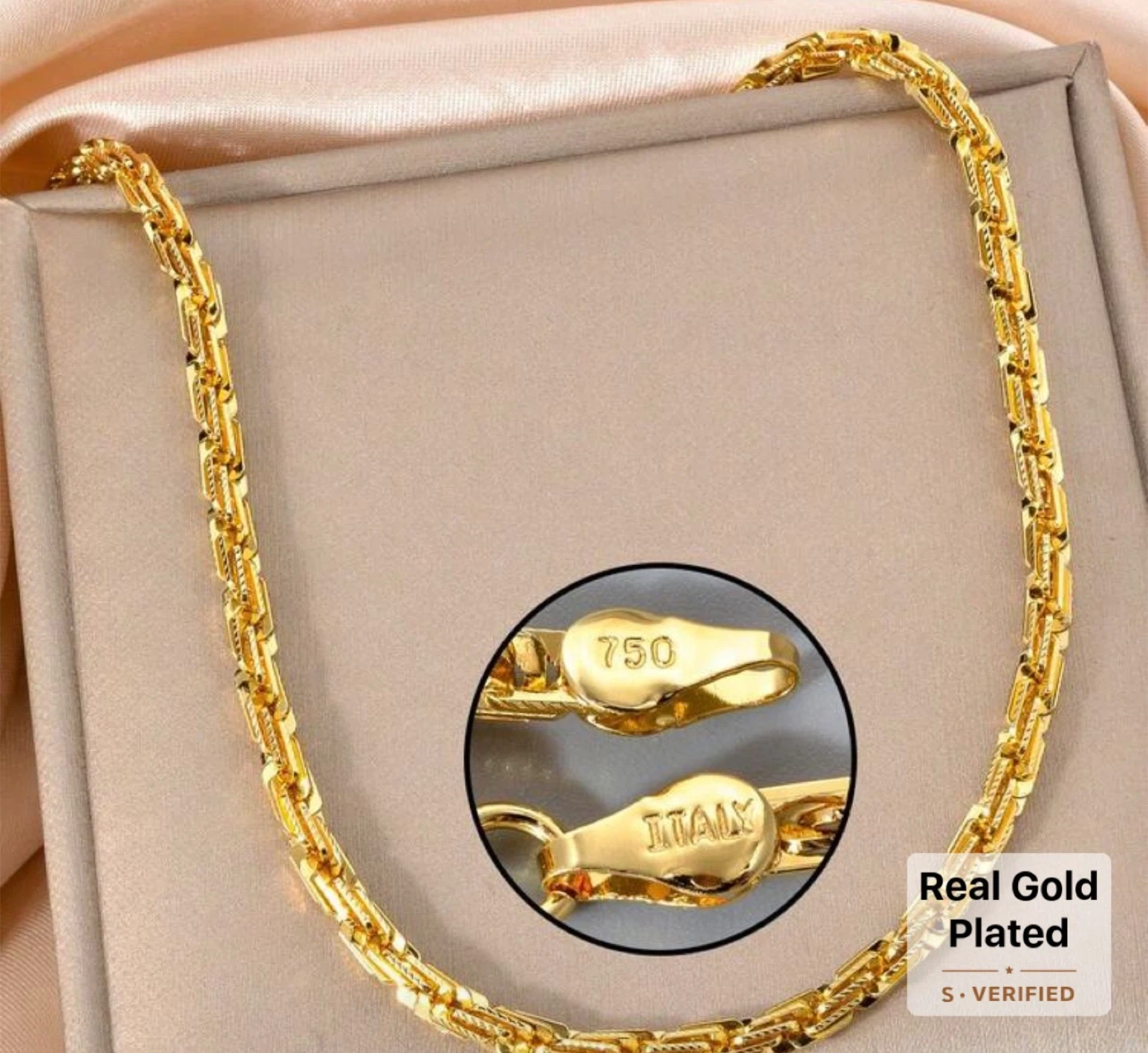 This gold plated chain necklace features "ITALY" and "750" stamps on its clasp. It's a lovely piece for everyday wear or special occasions. The chain's design is both elegant and durable.