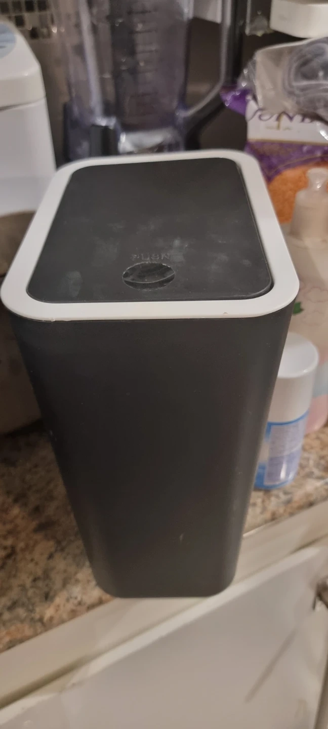 This is a simple black trash can with a white trim. It has a push button lid for easy opening. It's a great size for a small bathroom or office space.
