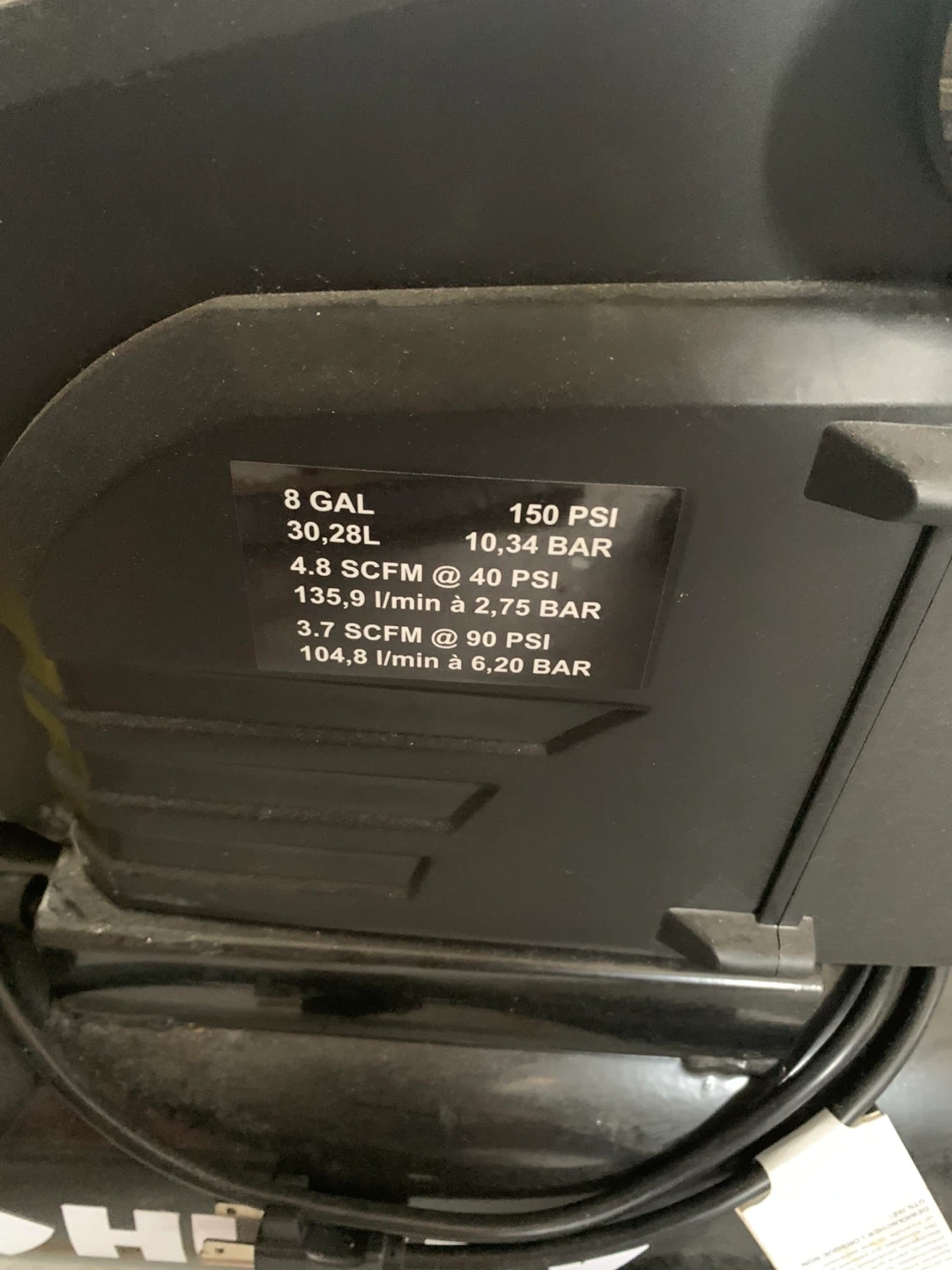 Husky 8-gallon air compressor with 150 PSI max pressure. It has 4.8 SCFM at 40 PSI. Includes a red air hose. Great for various air tool applications!