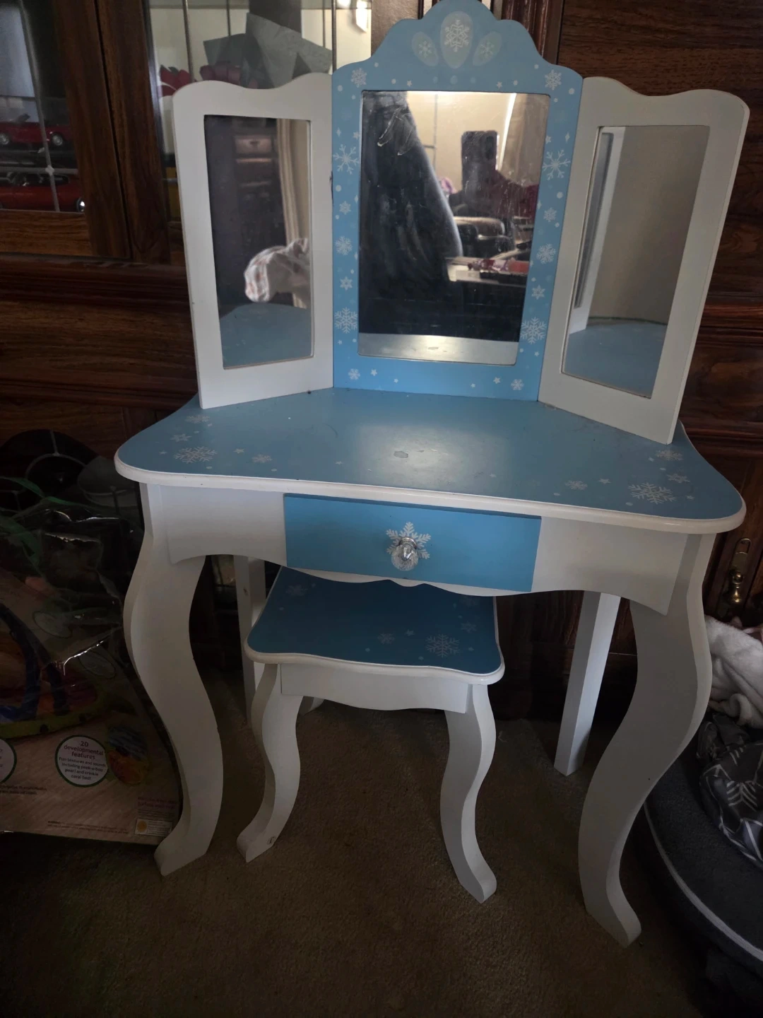 This adorable kids vanity set features a light blue and white design with snowflake accents. It has a tri-fold mirror and a single drawer for storage. A matching stool is included. Very frozen vibes