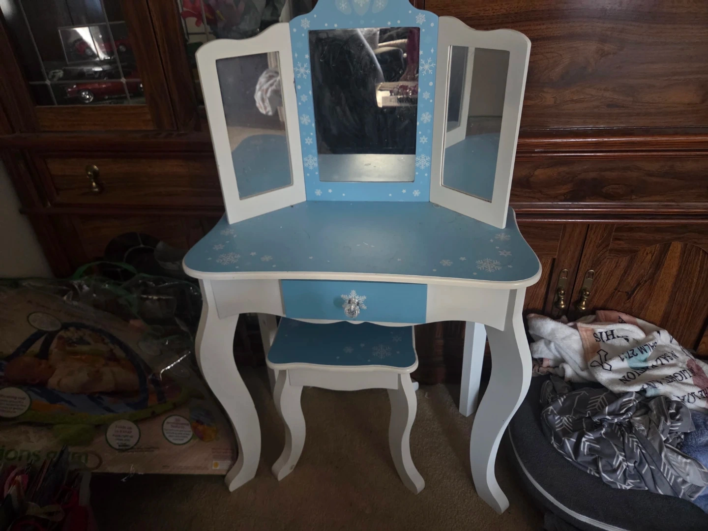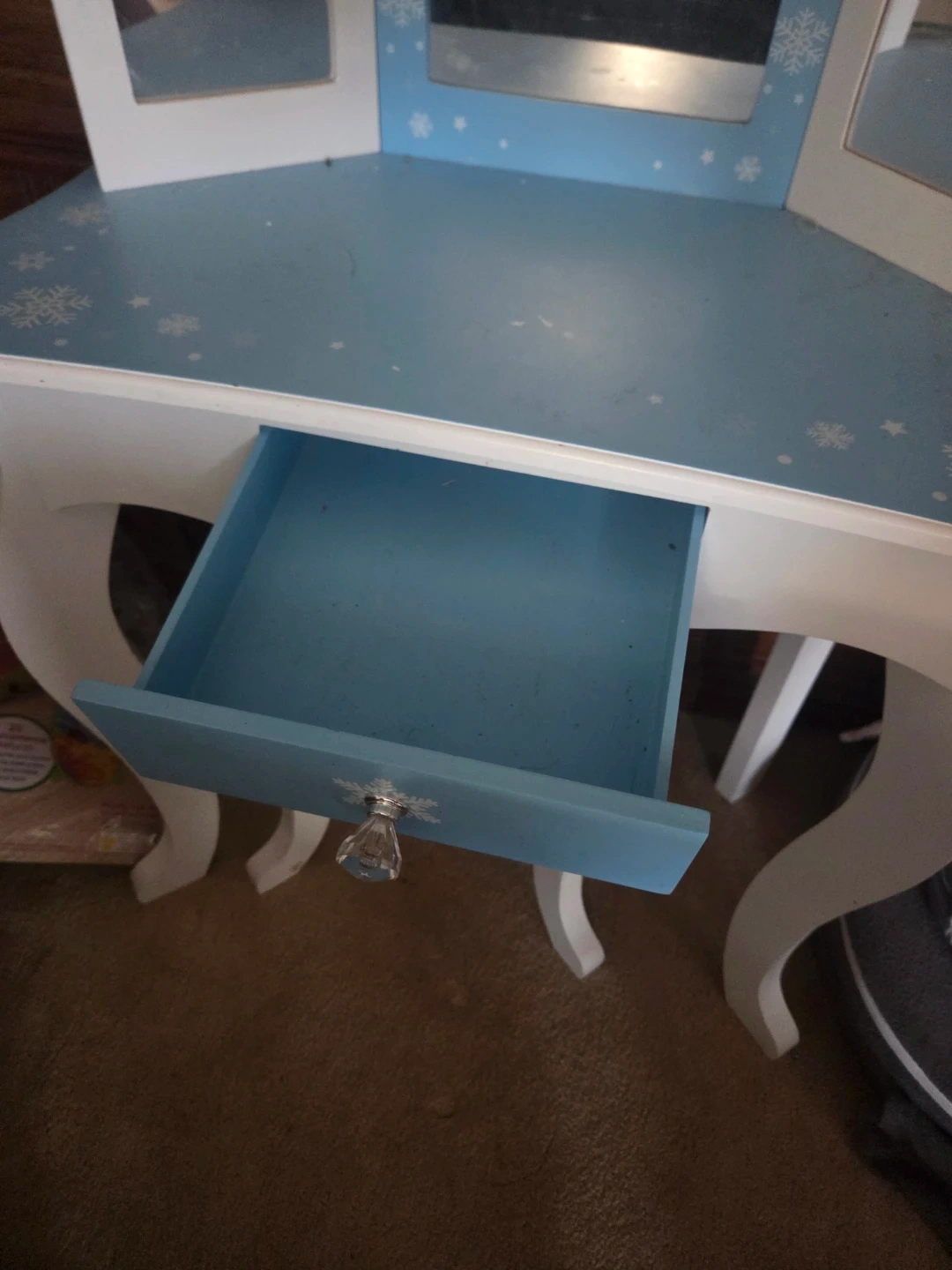 This adorable kids vanity set features a light blue and white design with snowflake accents. It has a tri-fold mirror and a single drawer for storage. A matching stool is included. Very frozen vibes