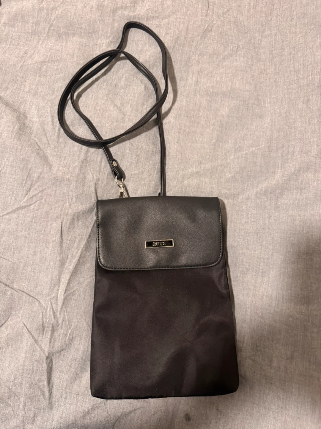 This is a Roots black crossbody bag with a faux leather flap. It has a long adjustable strap. It's a handy size for essentials.