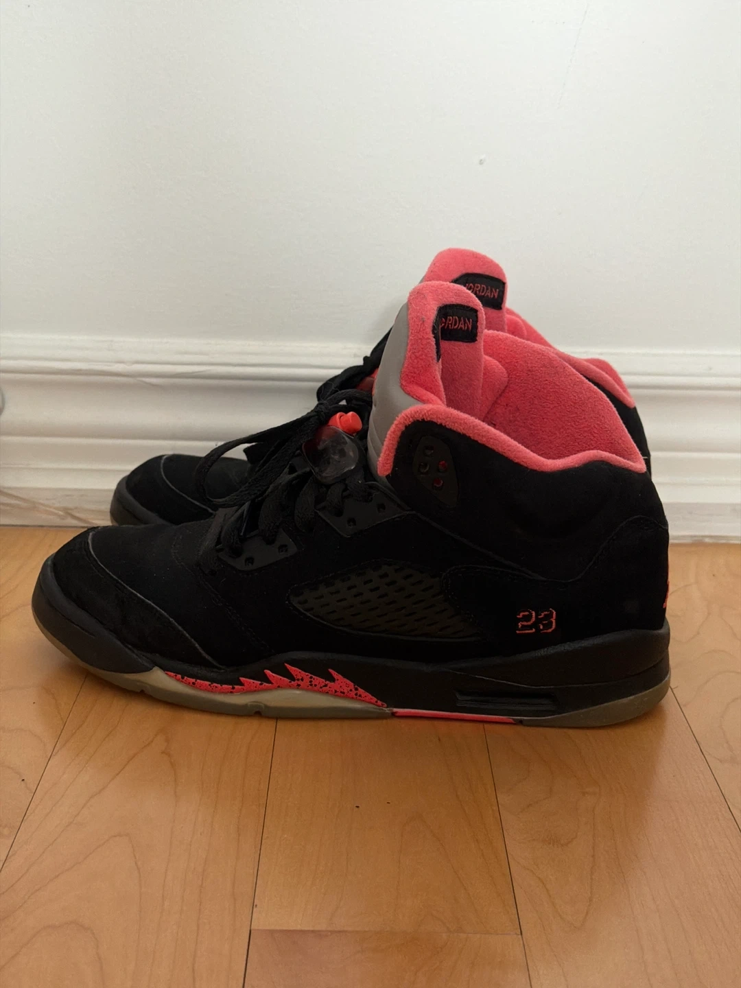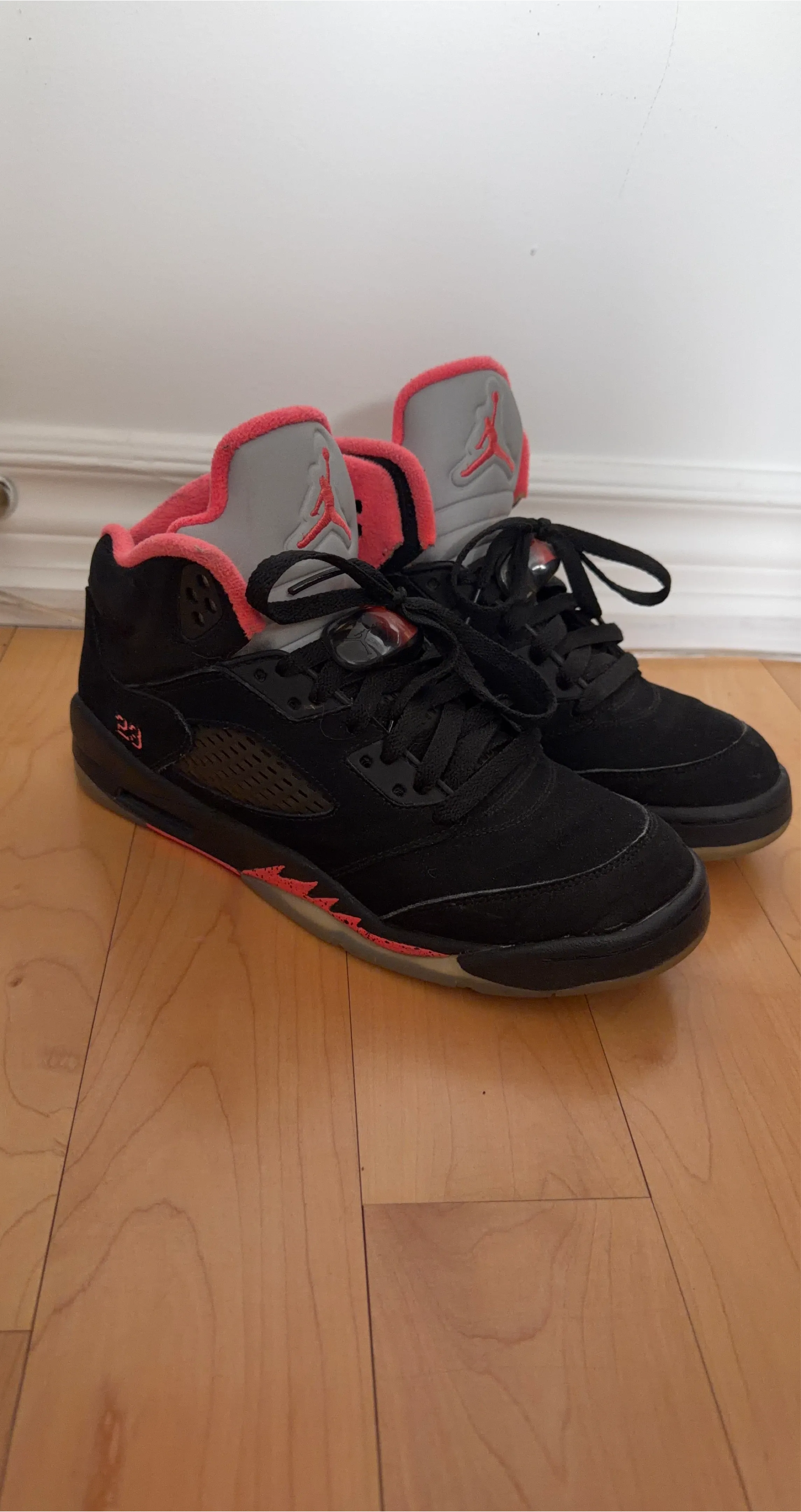 Buy & SellAir Jordan 5 Retro - Black Alarming (GS)Air Jordan 5 Retro - Black Alarming (GS)$160Black suede Air Jordan 5 Retro sneakers with pink accents. Includes Jumpman logo on the heel and tongue. Number 23 on the side. Size 7 youthConditionGoodAge6-8 yearsWHERE TO MEETMcDonaldView MapSELLERverifiedAlexTobosa Trail600 reviews1 chats·0 favorites·7 viewsSEND CHAT TO SELLERHi Alex! I’m interested in your listing.Hi Alex! I’m interested in your listing.Get the Karrot app to chatSign In to chat