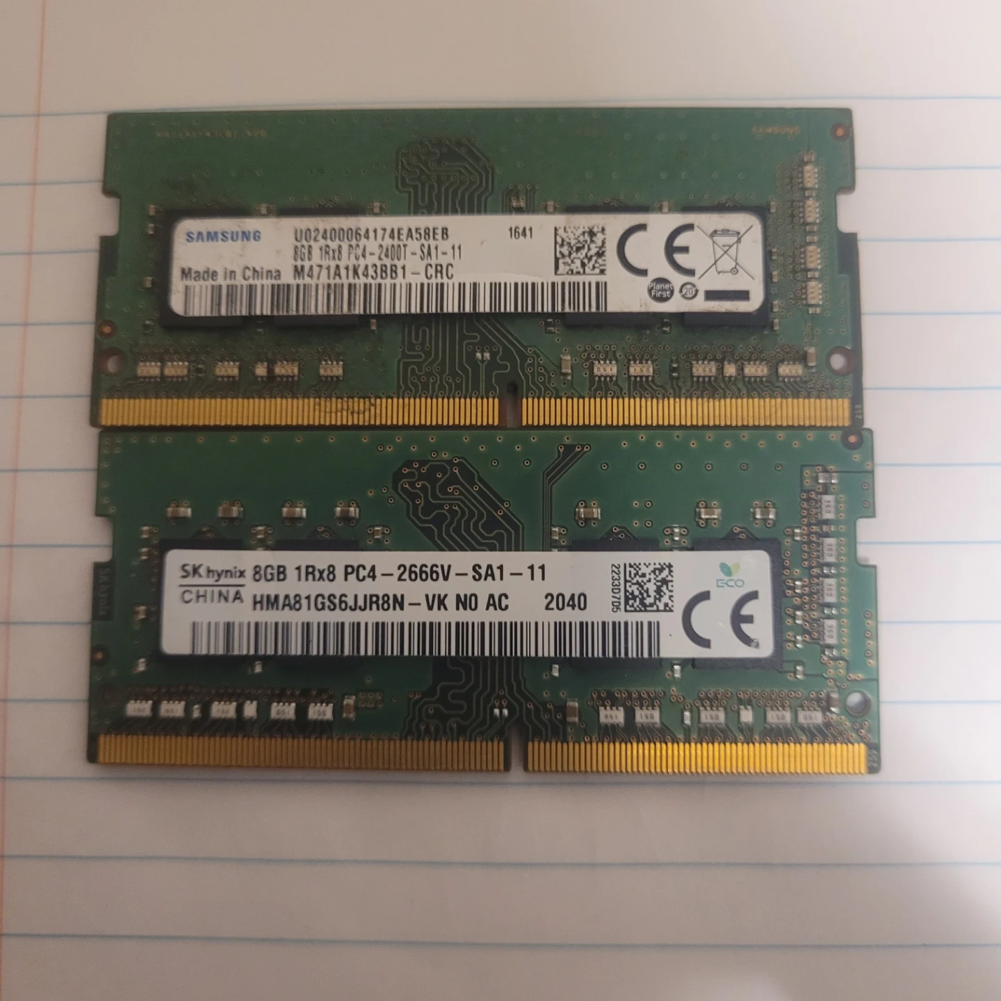 Two 8GB DDR4 RAM sticks included: one Samsung PC4-2400T and one SK Hynix PC4-2666V. These are laptop memory modules. Both are 8GB capacity and have a 1Rx8 configuration. They're good for upgrading computer memory! Asking $40 each or 2 for $30