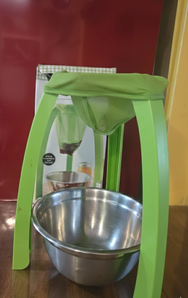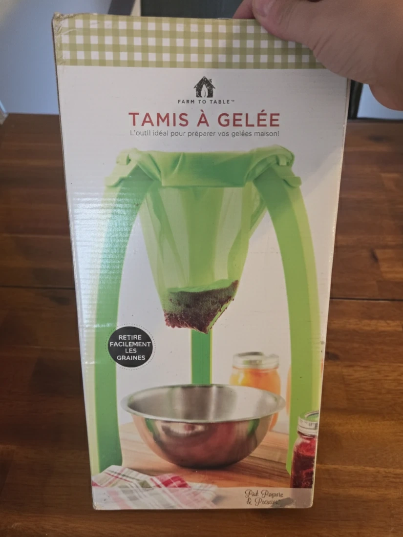 This jelly strainer from Farm to Table is designed to easily remove seeds when preparing homemade jellies. It includes a green plastic stand and a stainless steel bowl. The fine mesh bag strains out seeds effectively!