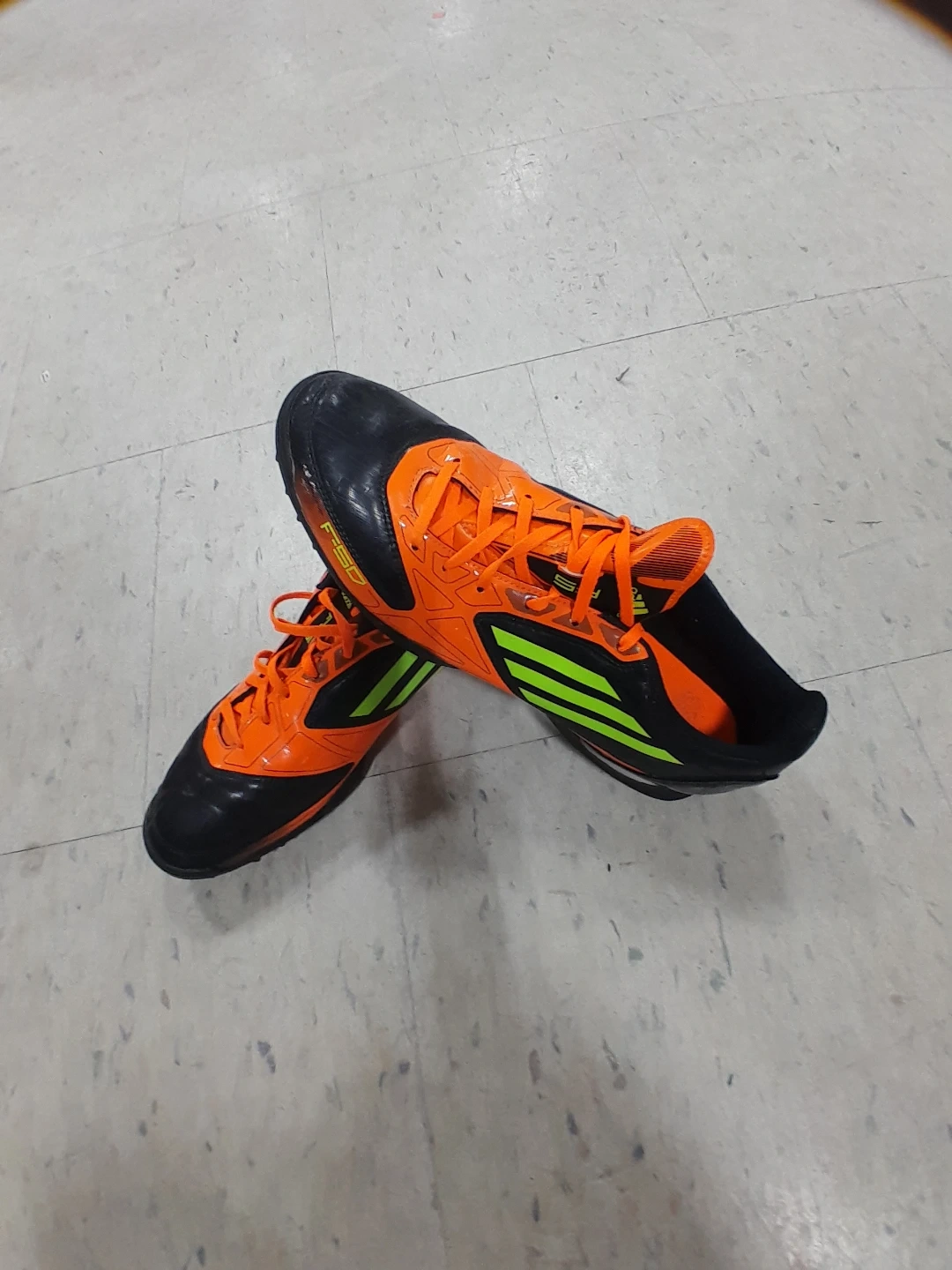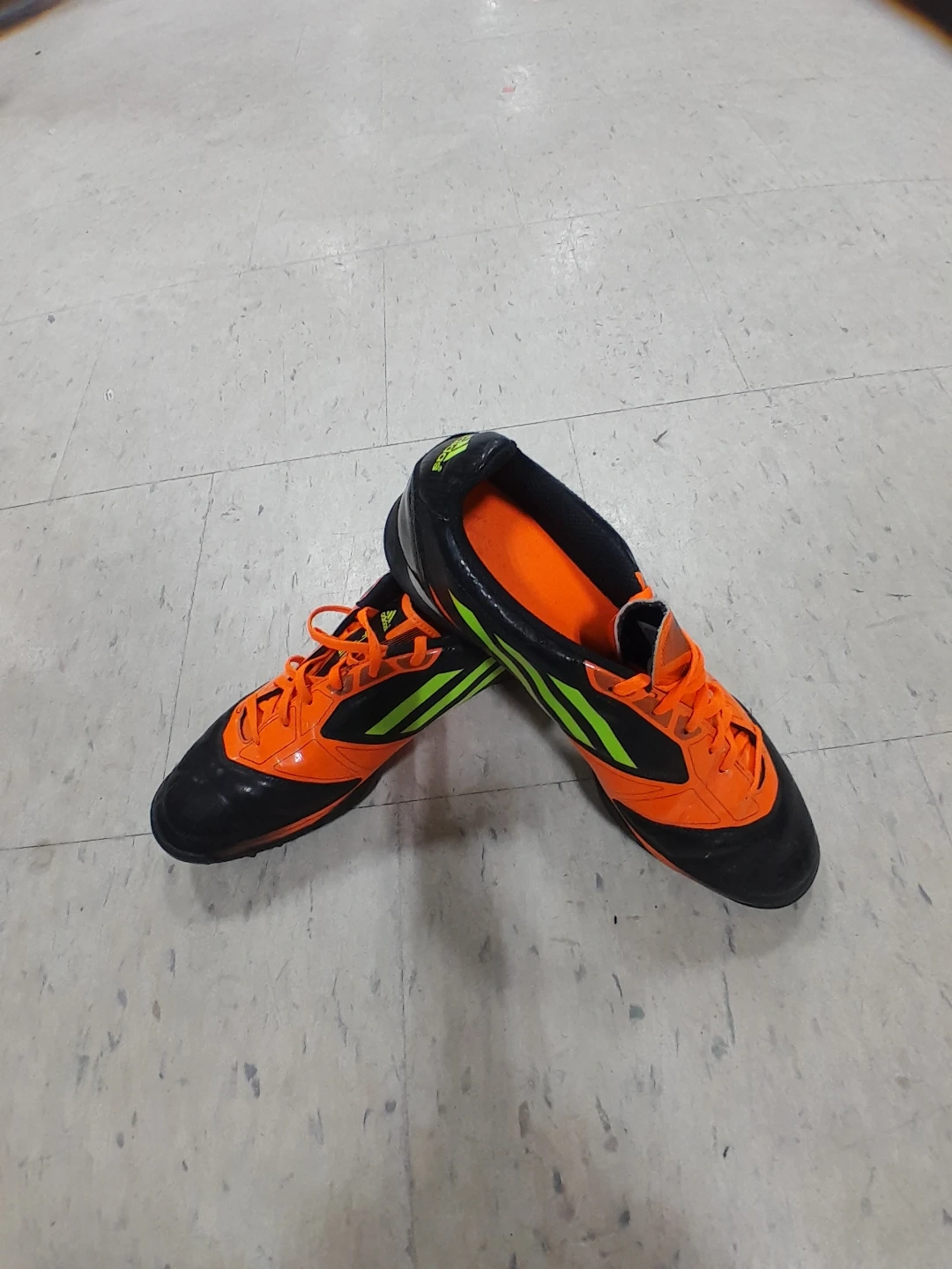 Adidas soccer cleats in black and orange. These shoes are designed for traction on the field. They feature a synthetic upper and a rubber outsole men's Size 9.5