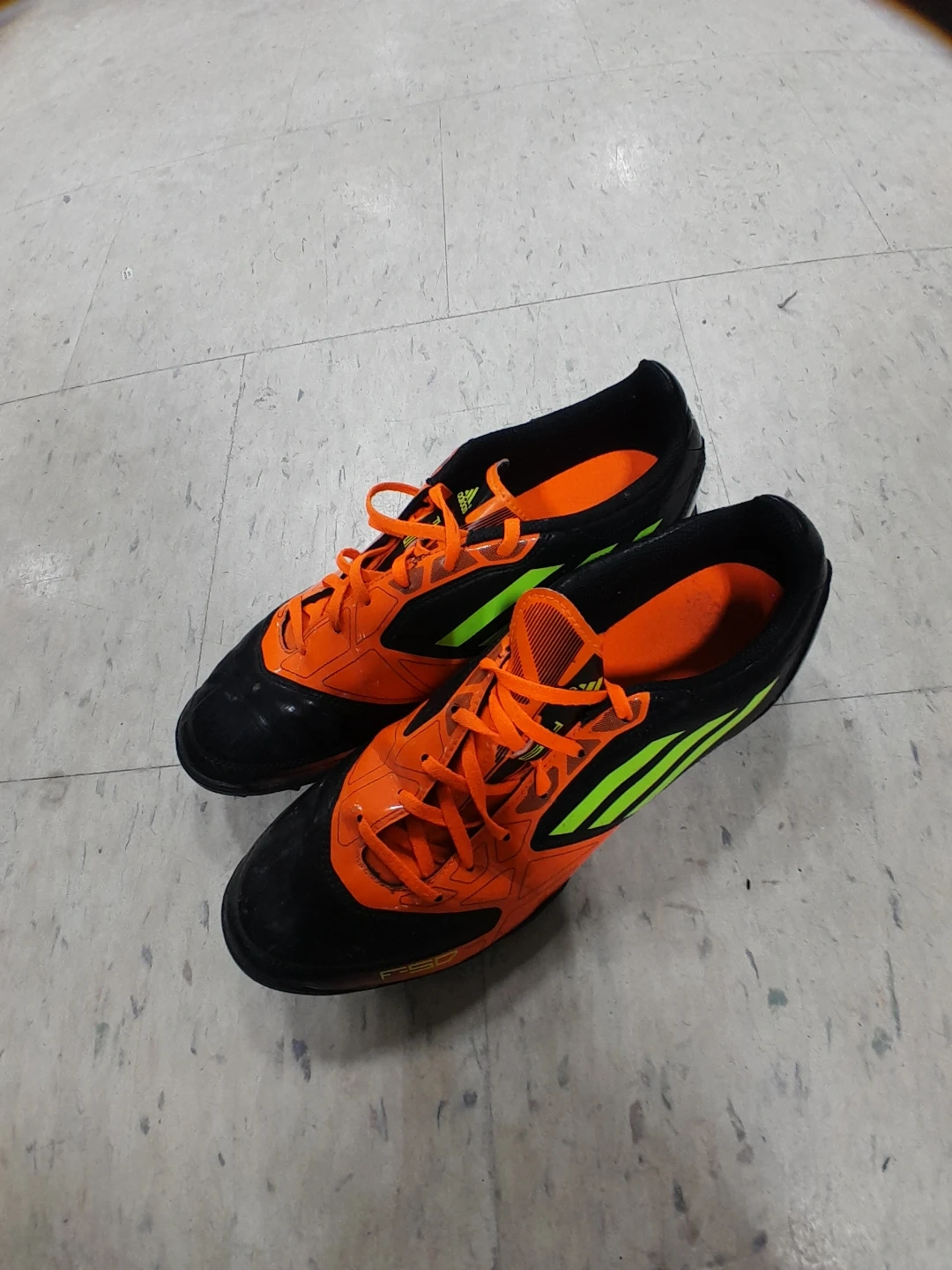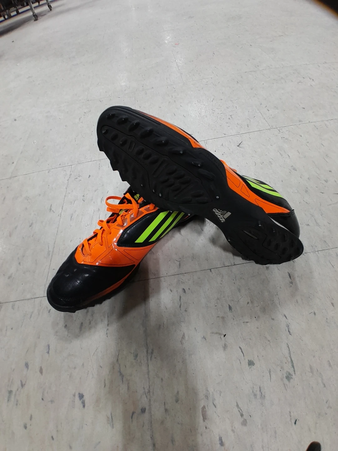 Adidas soccer cleats in black and orange. These shoes are designed for traction on the field. They feature a synthetic upper and a rubber outsole men's Size 9.5