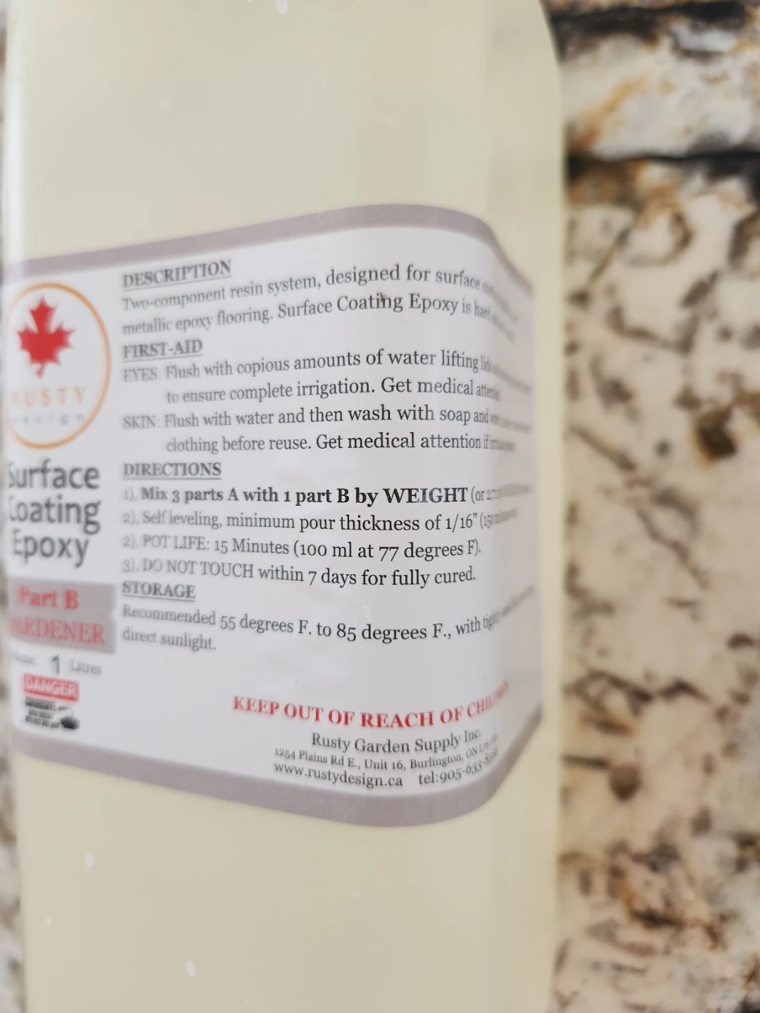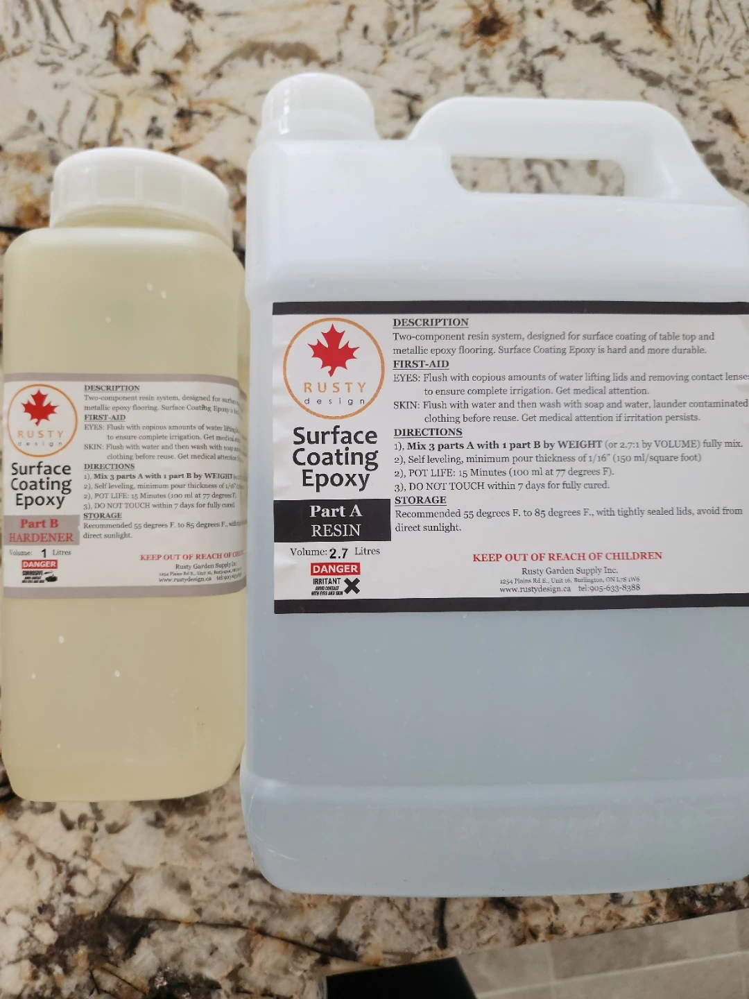 Two-component resin system for surface coating of table top and metallic epoxy flooring. Part A is 2.7 Litres and Part B is 1 Litre. Recommended storage is 55 to 85 degrees F with tightly sealed lids, away from direct sunlight. This epoxy is hard and more durable. Perfect for top coat.
