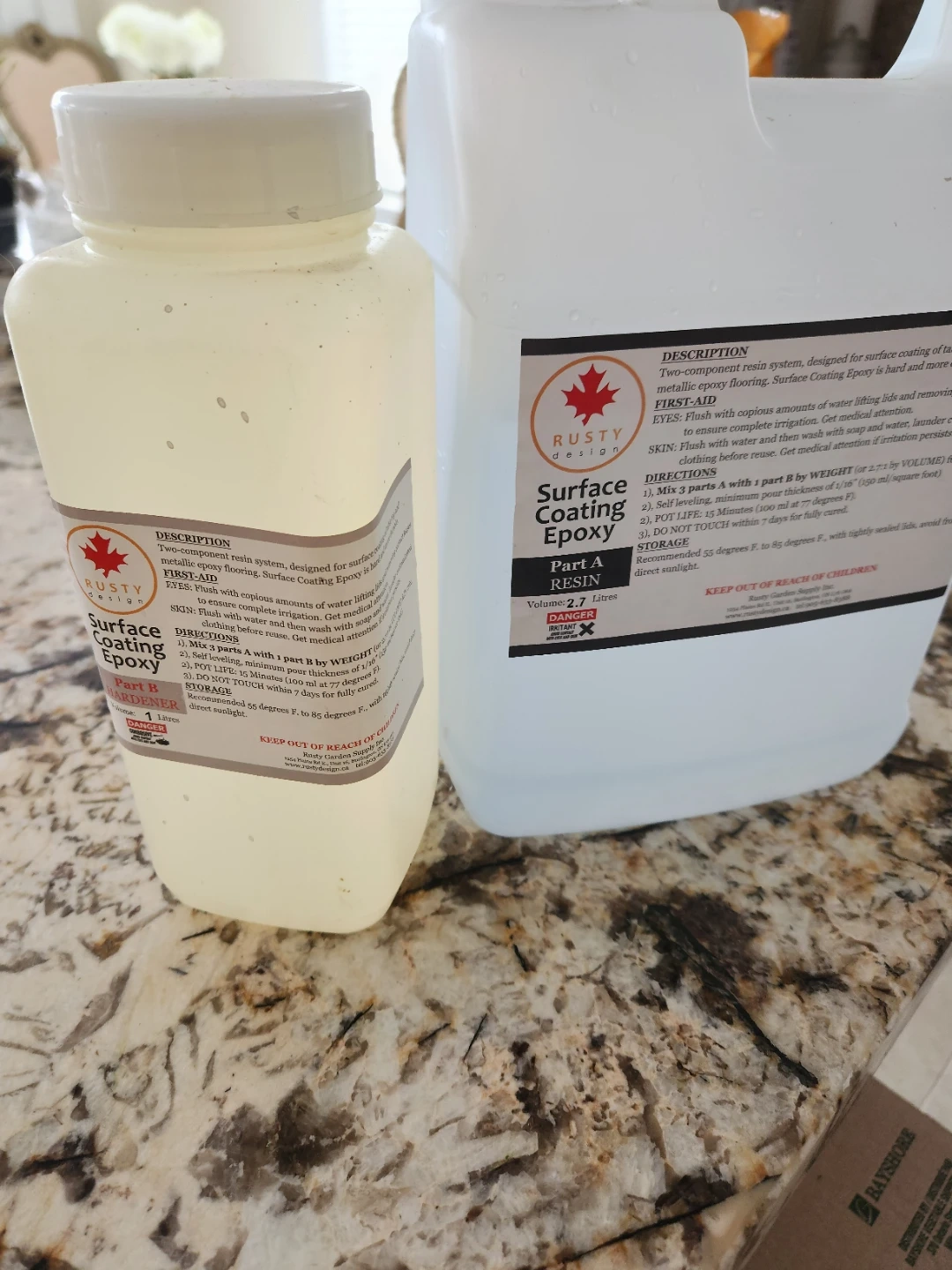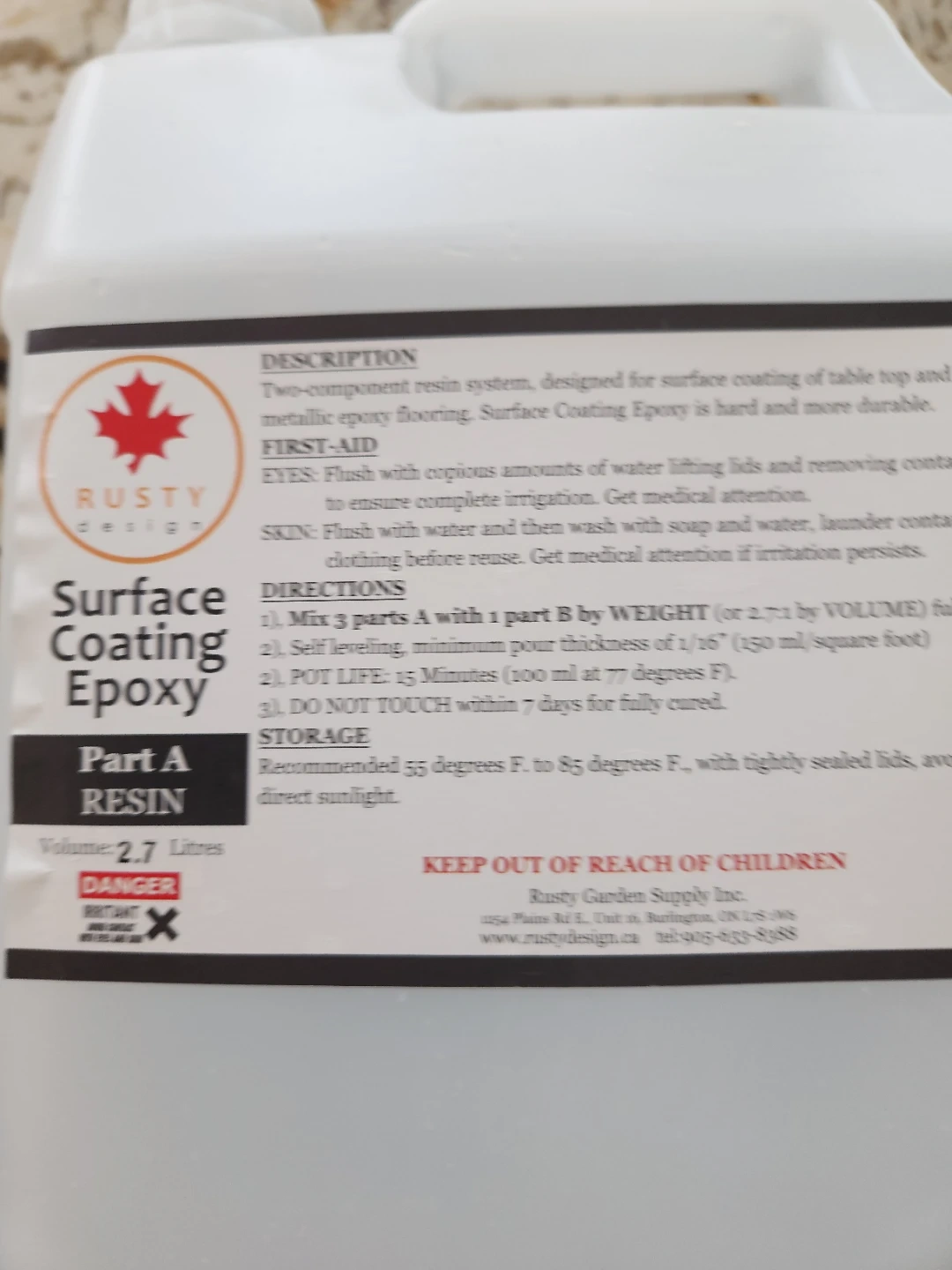 Two-component resin system for surface coating of table top and metallic epoxy flooring. Part A is 2.7 Litres and Part B is 1 Litre. Recommended storage is 55 to 85 degrees F with tightly sealed lids, away from direct sunlight. This epoxy is hard and more durable. Perfect for top coat.