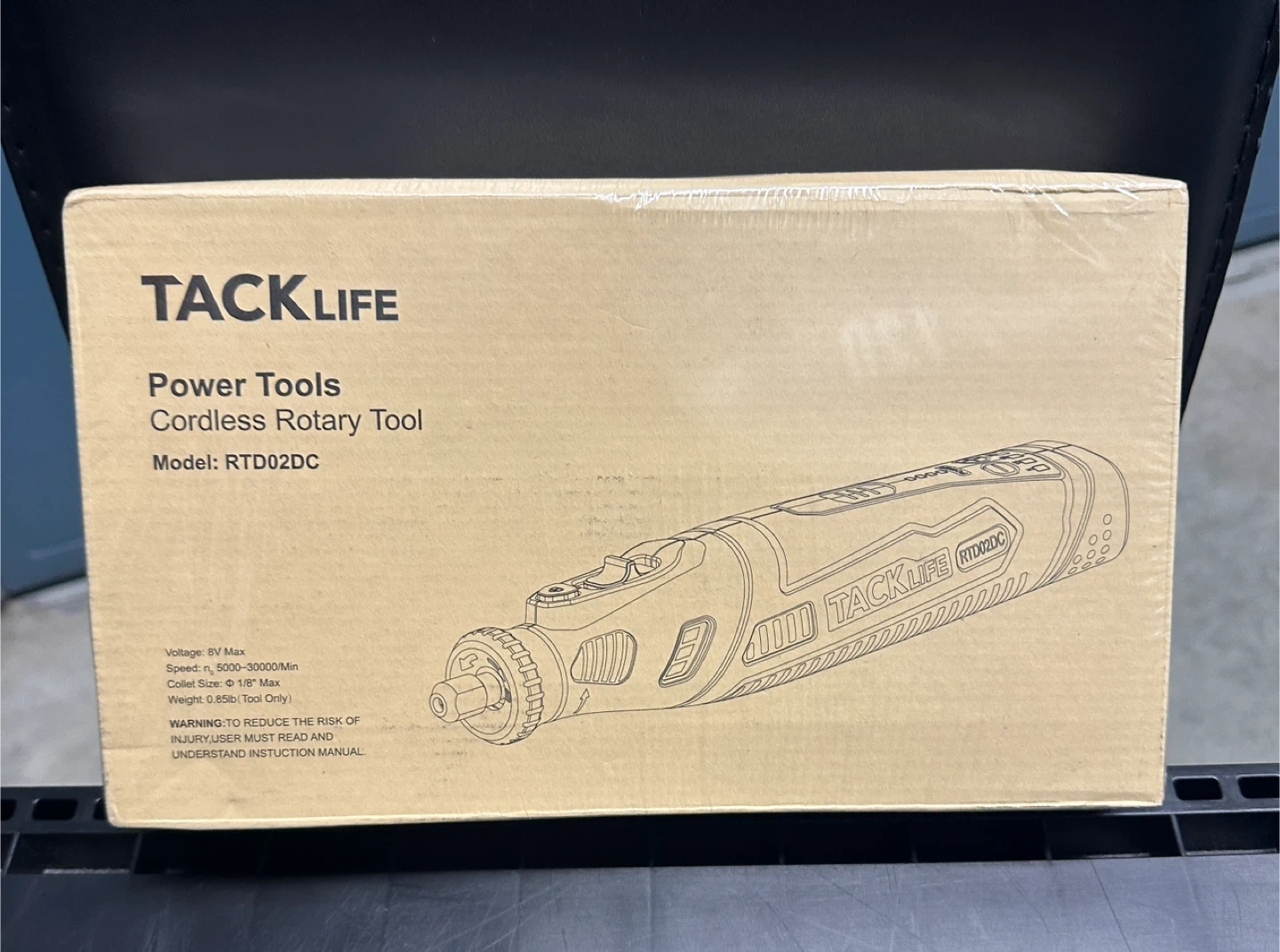 Tacklife cordless rotary tool, model RTD02DC. Includes original box. Voltage: 8V Max. Speed: 5,000-30,000 R/Min. Collet Size: 1/8" Max. Weight: 0.85lb. Tool Only.